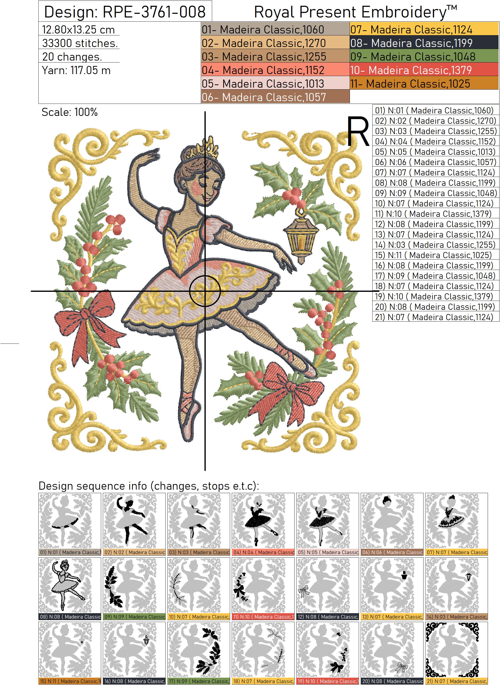 Волшебный и утончённый дизайн «Рождественская Мари балерина» создан в классическом праздничном стиле с балетным настроением. Лёгкая поза, изящный костюм и рождественские акценты создают ощущение сказки и тепла. Этот дизайн машинной вышивки идеально подойдёт для зимних и новогодних проектов, а также станет прекрасным дополнением к серии — обратите внимание на дизайн поменьше Мари балерина дизайн машинной вышивки для создания гармоничных комплектов.