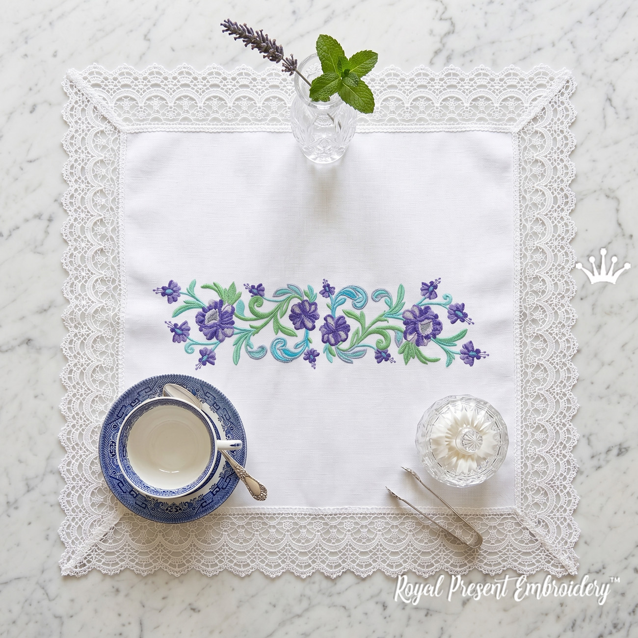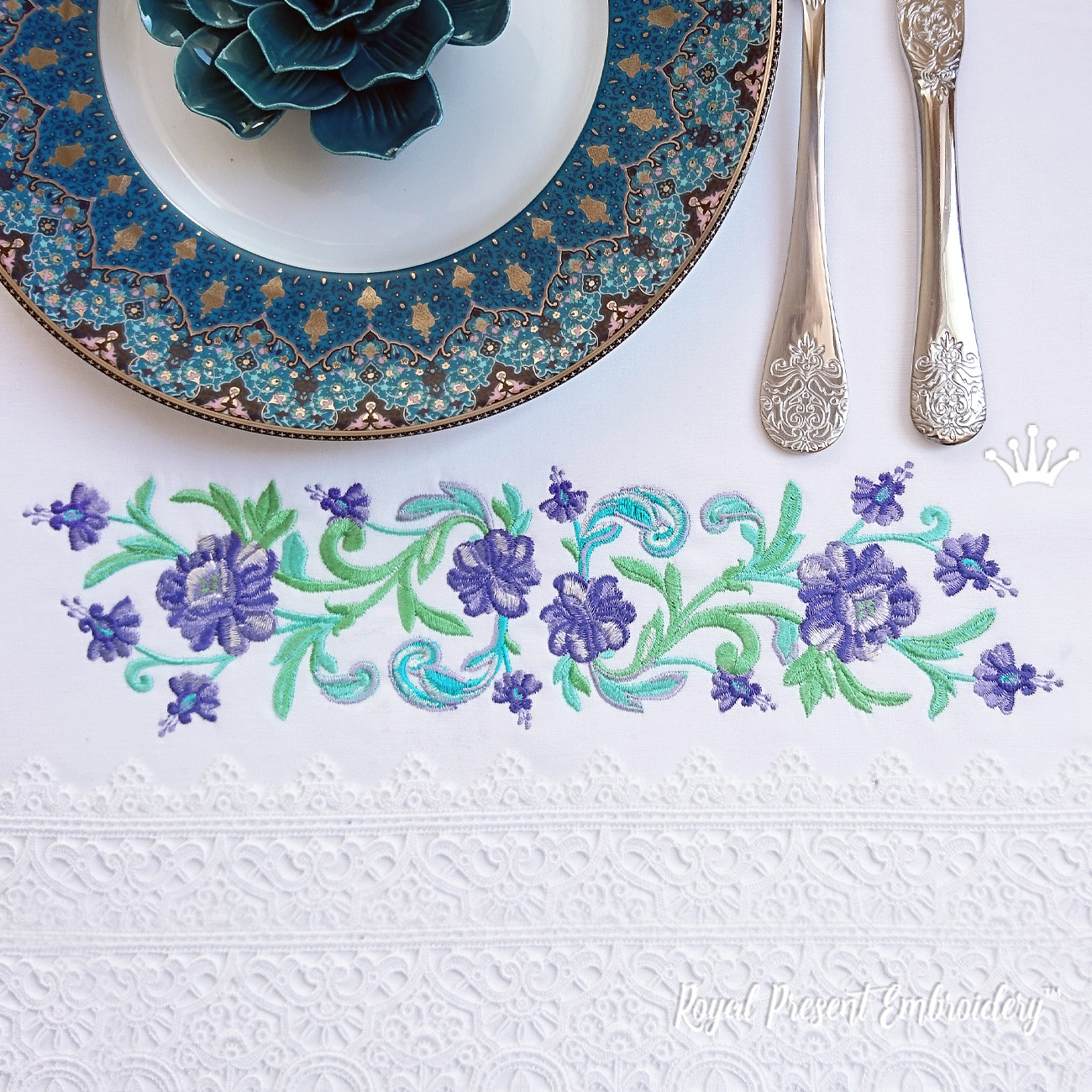 Изумрудный цветочный бордюр — элегантный дизайн машинной вышивки с фиолетовыми цветами и изумрудными акцентами. У дизайна есть компаньон — Изумрудный цветок, для создания красивой согласованной коллекции.
