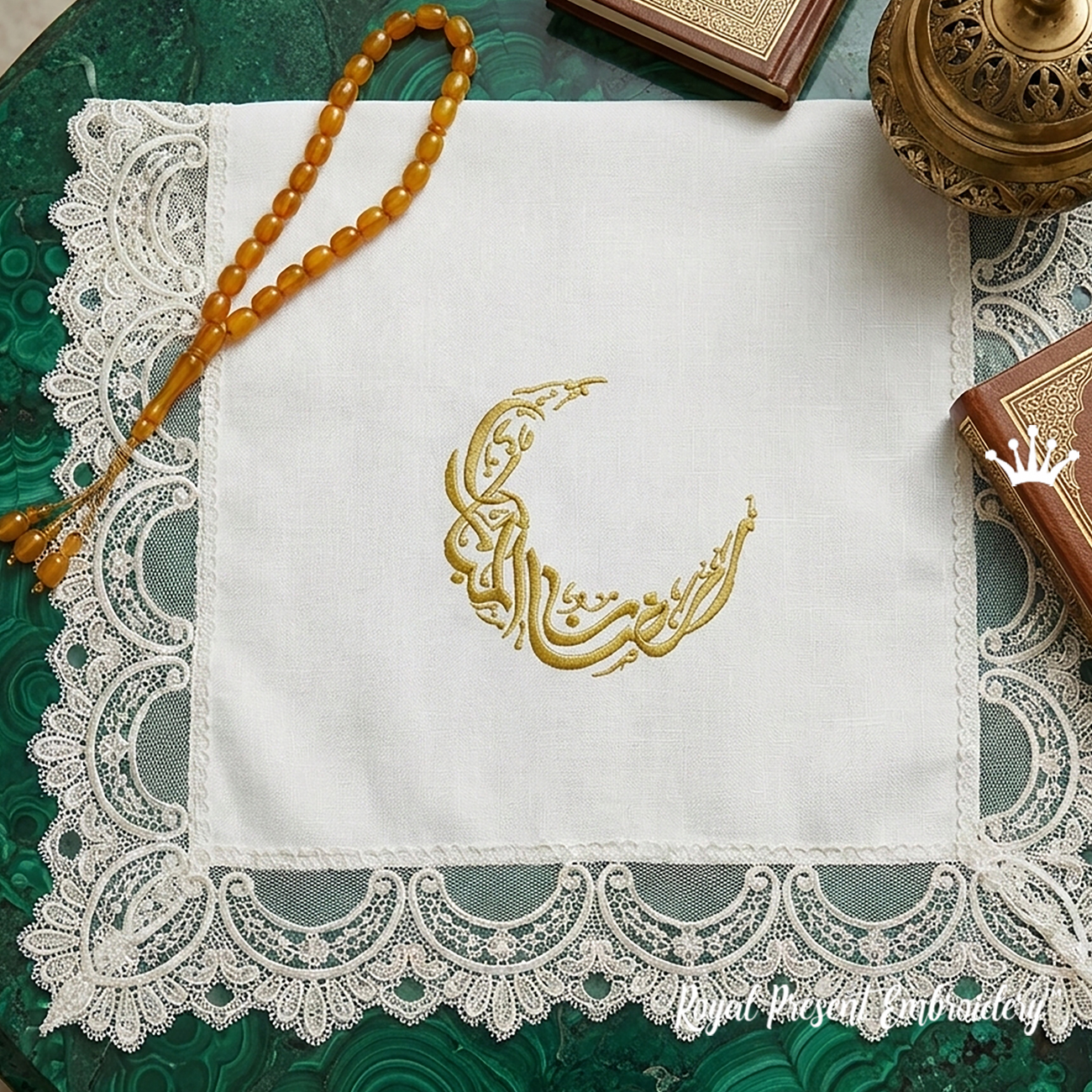 Рамадан Карим это дизайн машинной вышивки, выполненный в изящном стиле арабской каллиграфии в форме полумесяца. Это цифровой файл для машинной вышивки. Дизайн станет изысканным и глубоким акцентом в декоре к исламским праздникам — отлично подходит для оформления домашнего текстиля, молитвенных ковриков, праздничных салфеток и подарков. Идеален для тех, кто ценит элегантные религиозные мотивы и культурную символику.