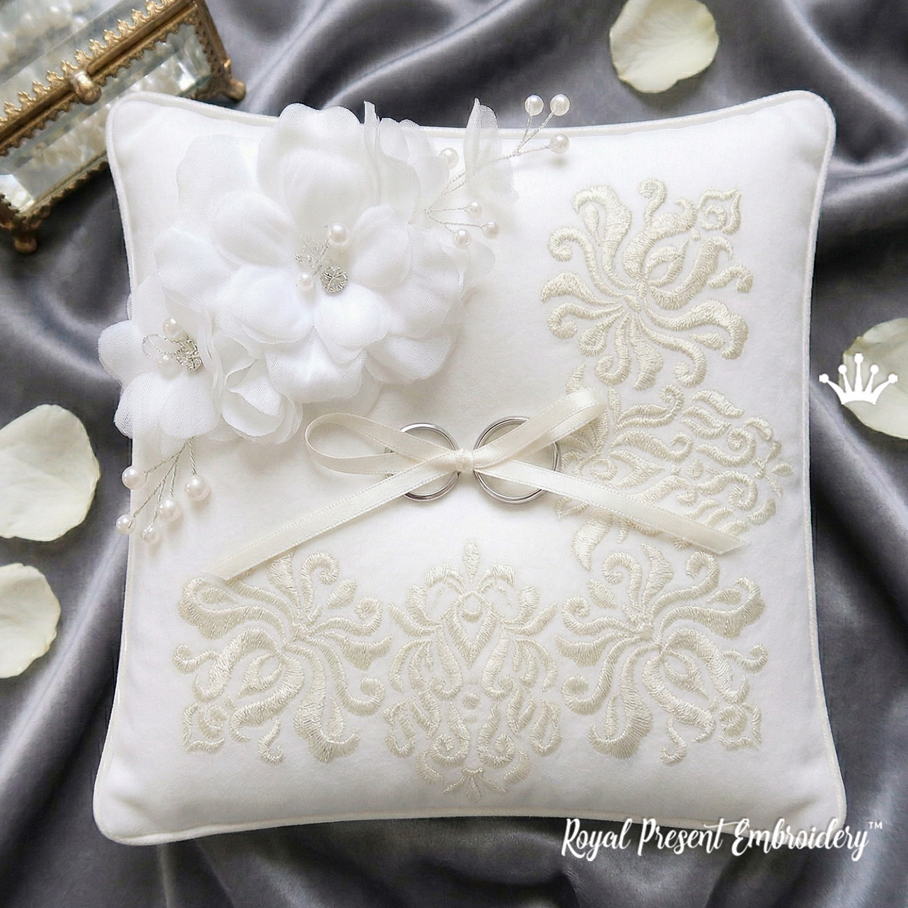 Особенно красиво смотрится в технике белым по белому на хлопке или льне, создавая утончённый и дорогой эффект, а также в оттенках айвори или топленого молока для мягкого, благородного результата. Отличный выбор для свадебных подушечек для колец, подарков и интерьерного текстиля премиум-класса. Мгновенная загрузка, все размеры и форматы включены.