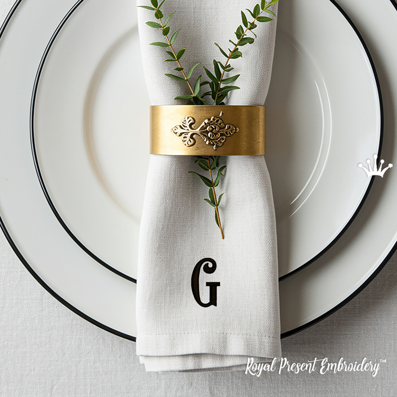 Заглавная буква G дизайн машинной вышивки с аккуратной декоративной формой, подходящей для персонализации текстильных изделий. Такой дизайн удобно использовать для вышивки на мешочках для нижнего белья, где важны чистые линии, компактный размер и аккуратный внешний вид. Буква хорошо читается и не перегружает изделие, создавая сдержанный декоративный акцент.