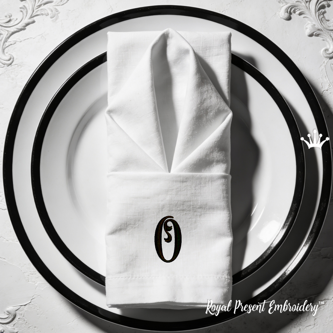 Заглавная буква O вариант 4 дизайн машинной вышивки с аккуратной декоративной формой, выполненной в классическом стиле. Буква выглядит сбалансированно и чётко, хорошо читается даже в небольшом размере и подходит для точной персонализации текстильных изделий. Дизайн можно использовать для вышивки на салфетках, носовых платках, косметичках, мешочках для белья и других аккуратных аксессуарах.