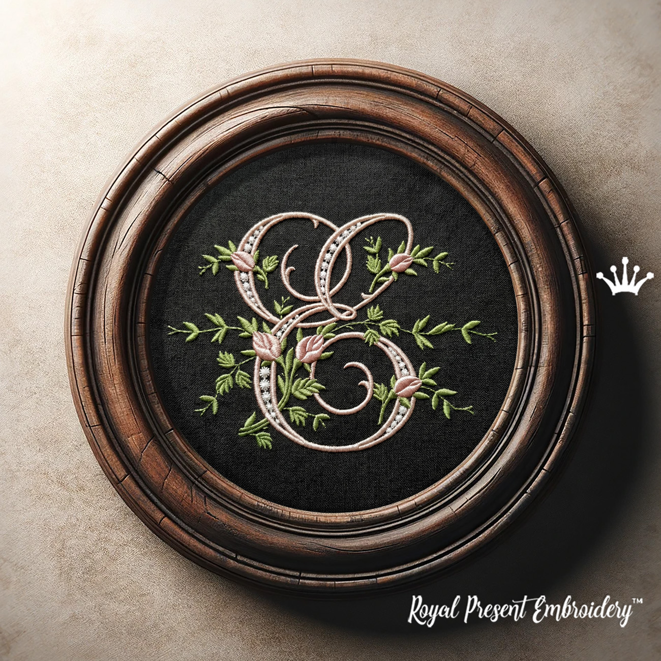 Элегантная винтажная цветочная монограмма с буквой E, украшенной детализированными розами и декоративной листвой. Изысканный дизайн идеально подходит для создания персонализированной вышивки на свадебных салфетках, полотенцах, наволочках, дорожках на стол и премиальном домашнем текстиле.