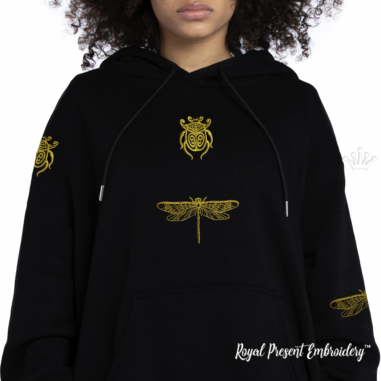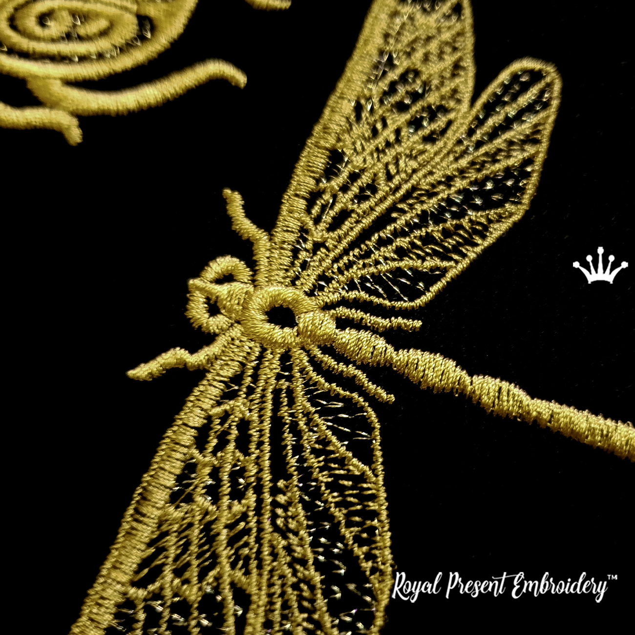 Представляем изысканный набор дизайнов машинной вышивки — "Ажурные Стрекоза и Жук". Этот комплект сочетает в себе утонченность, симметрию и винтажную эстетику. Золотистая вышивка на темной ткани придает образам особую выразительность и благородство, а ажурные крылья стрекозы и декоративные узоры жука — ощущение ювелирной точности.