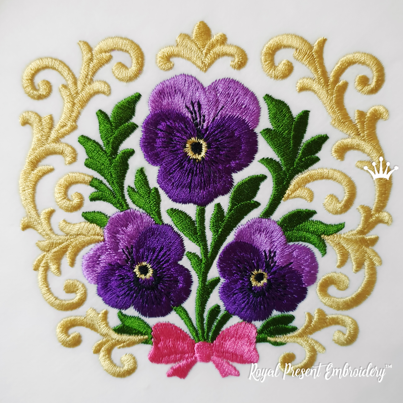 Барочный орнамент с анютиными глазками и бантом — это дизайн машинной вышивки в виде цифрового файла. Композиция объединяет выразительные цветы анютиных глазок, декоративную барочную рамку и аккуратный бант, создавая цельный и гармоничный образ. Дизайн выглядит изящно и благородно, подходит для тех, кто ценит классическую декоративную вышивку и продуманные детали. Он хорошо вписывается как в интерьерные проекты, так и в текстиль для дома и одежды.