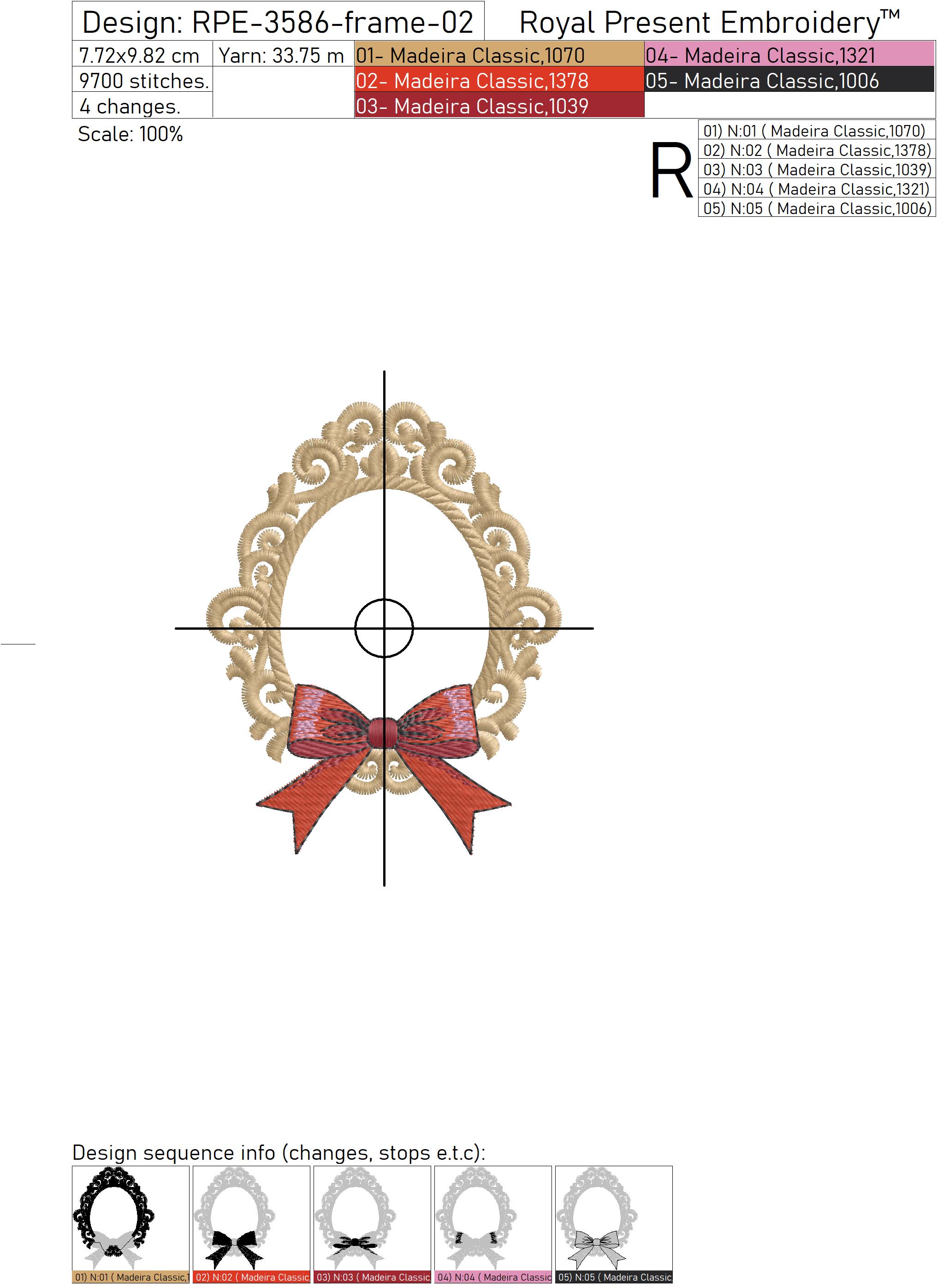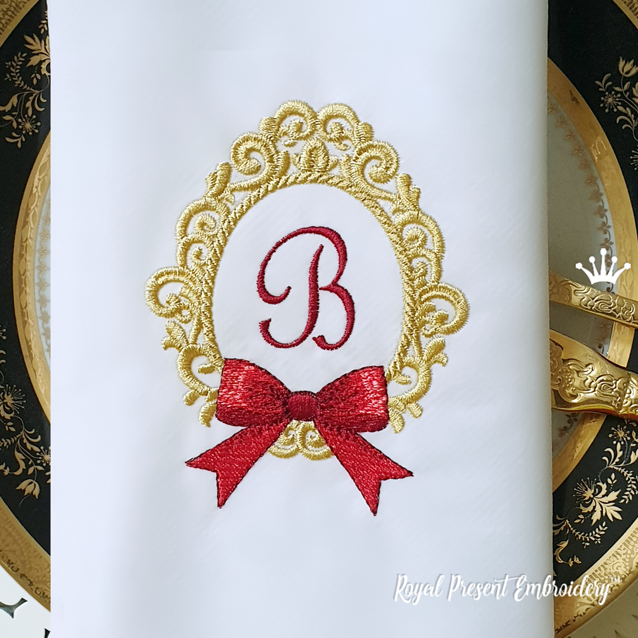 Барокко золочёная рамка с бантом дизайн машинной вышивки — изысканный акцент для текстиля. Идеален для персонализации салфеток, кухонных полотенец и праздничного декора. Формат для пялец 100x100 мм (примерно 4x4 дюйма) делает его удобным для небольших, но эффектных проектов. Внутрь можно добавить инициал, создавая монограммы для сервировки или подарков.