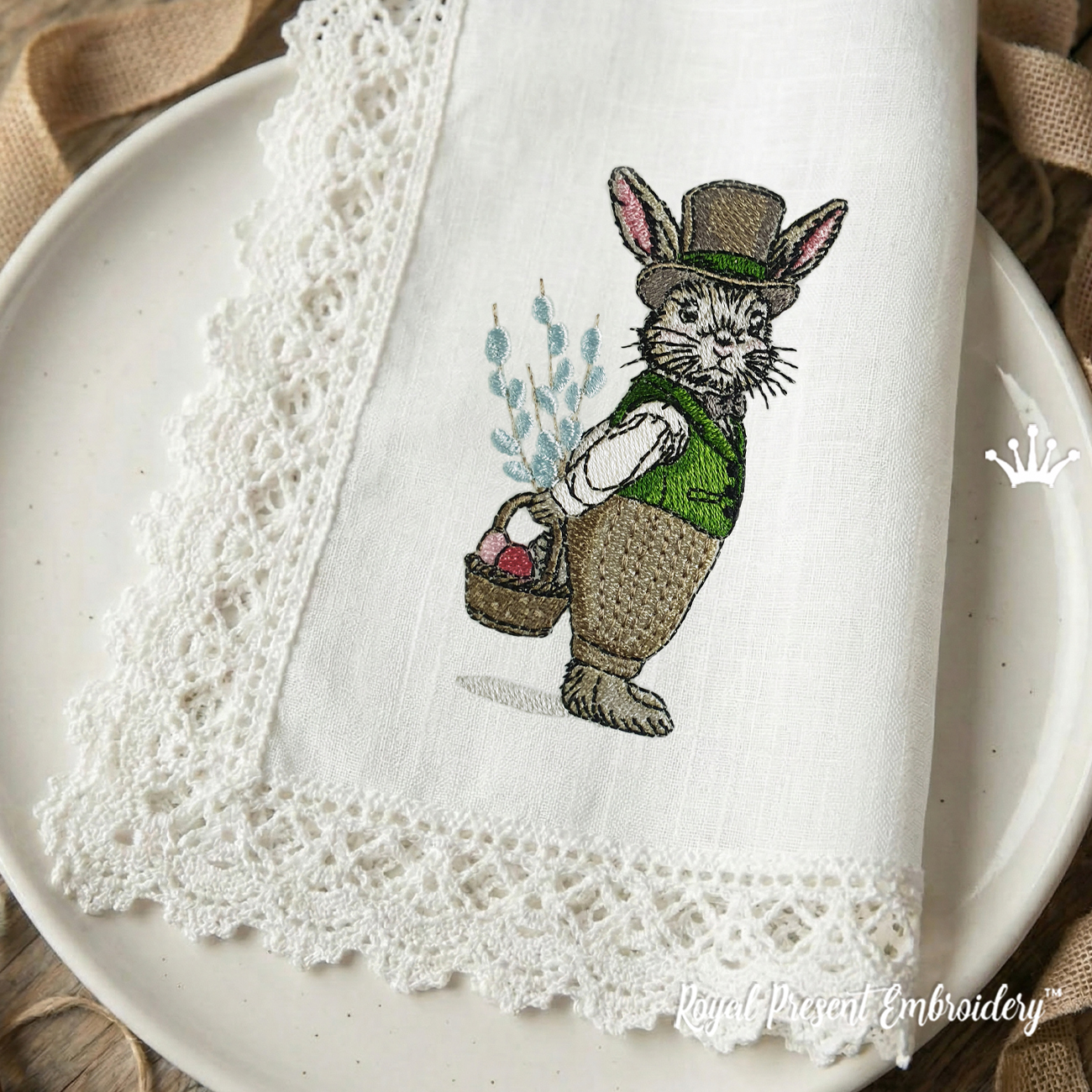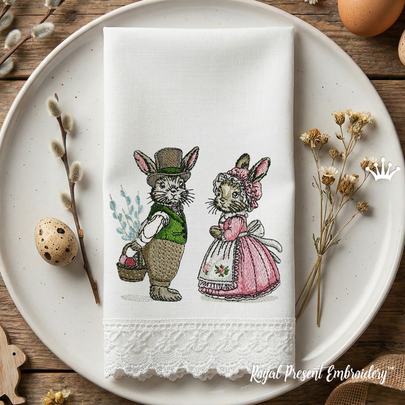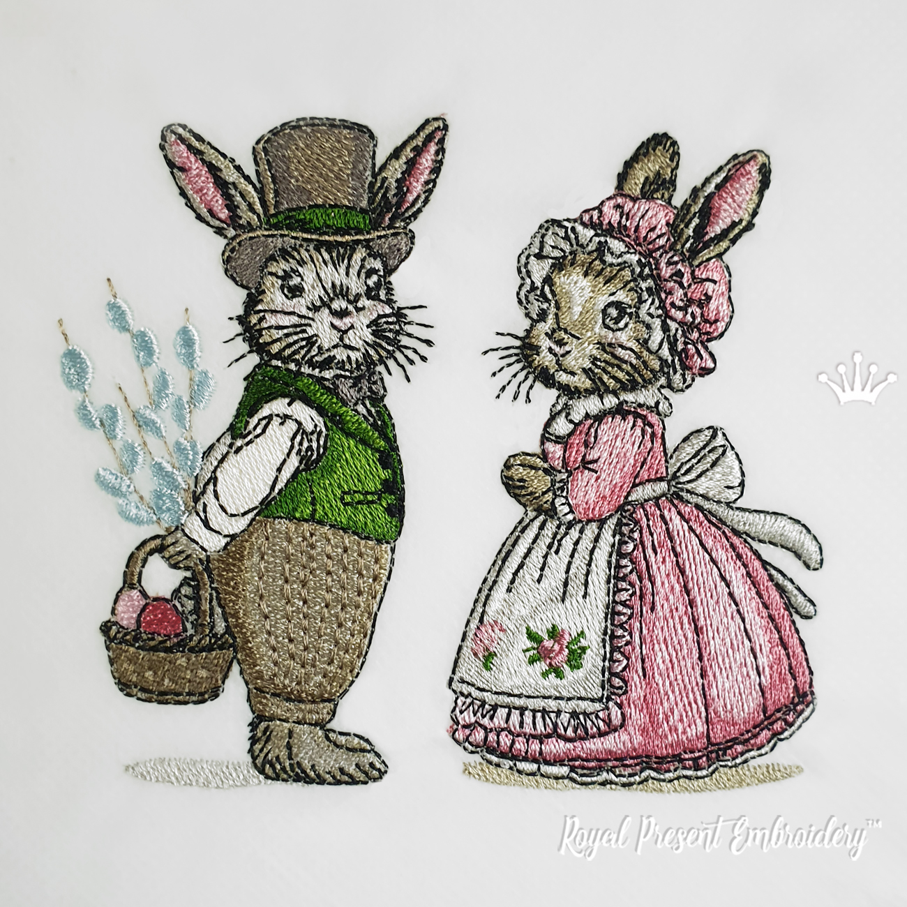 Два винтажных весенних кролика Набор — это дизайн машинной вышивки с очаровательной пасхальной атмосферой. В набор входят два винтажных кролика: джентльмен в цилиндре с корзиной и дама в весеннем платье и чепце.