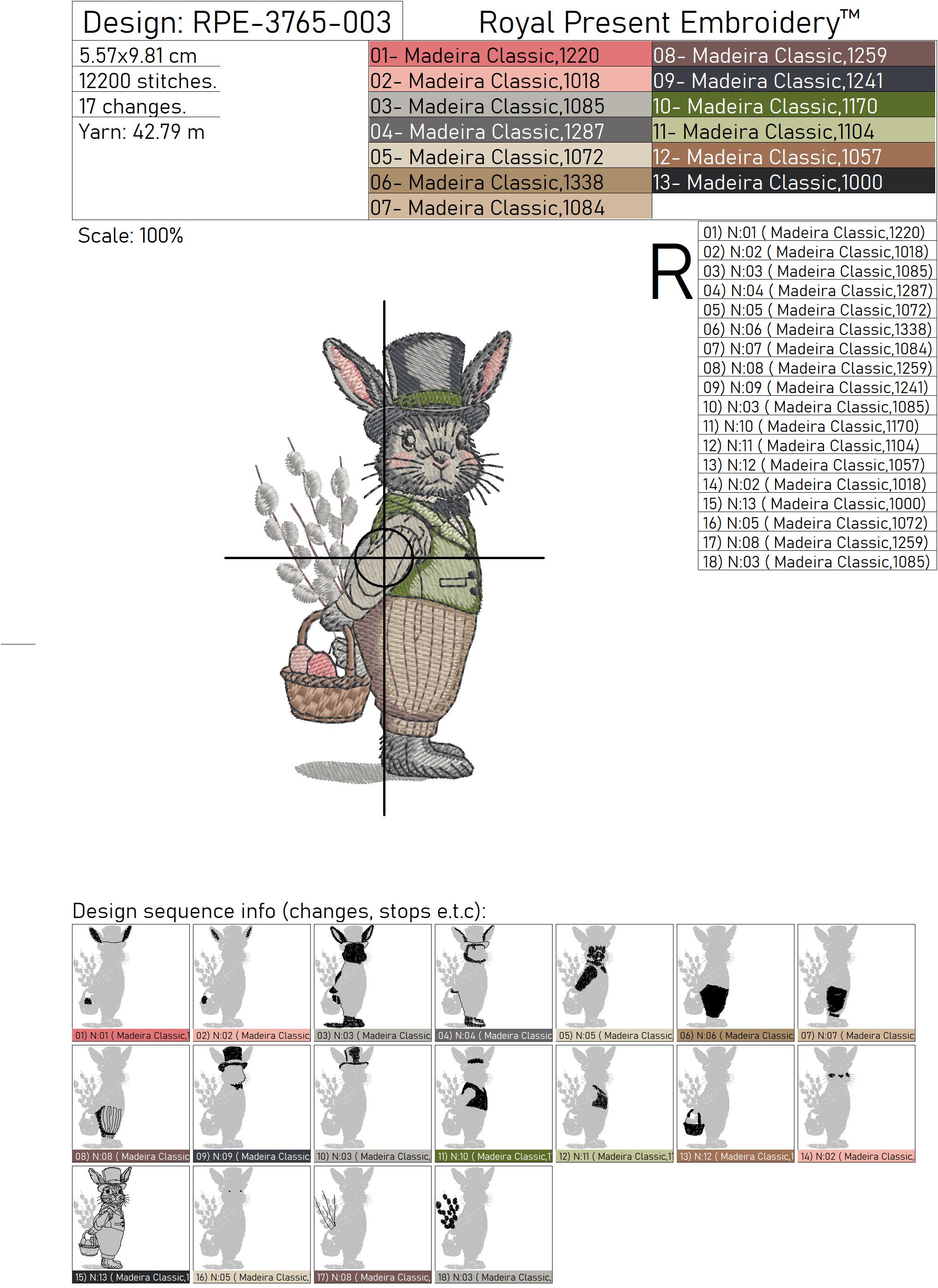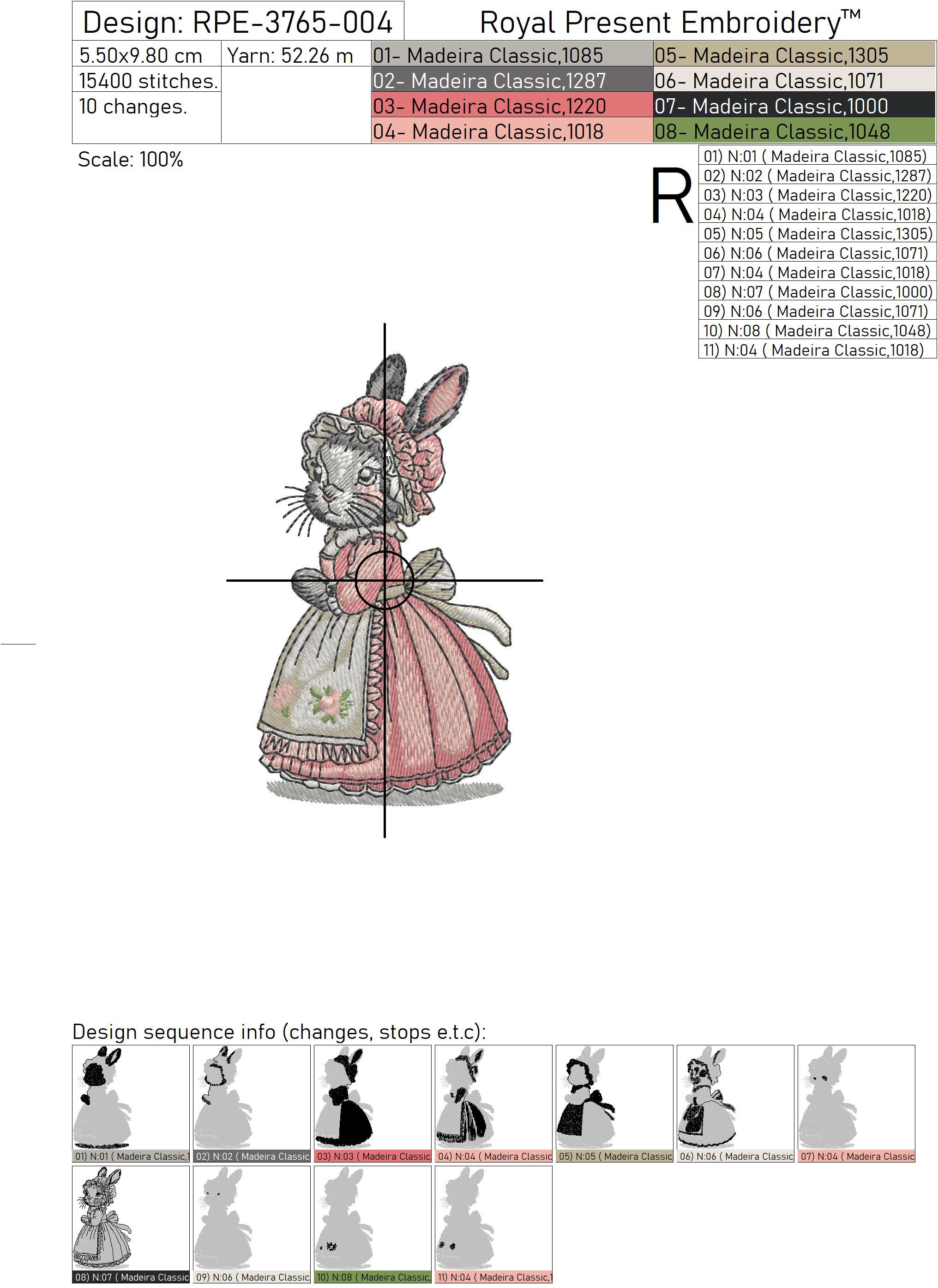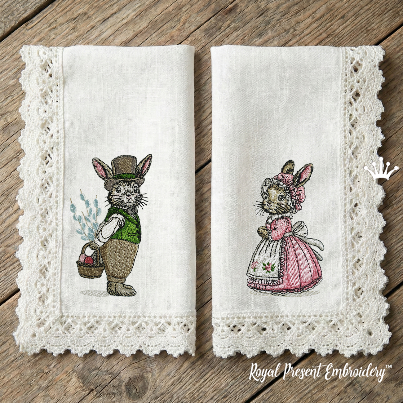 Два винтажных весенних кролика Набор — это дизайн машинной вышивки с очаровательной пасхальной атмосферой. В набор входят два винтажных кролика: джентльмен в цилиндре с корзиной и дама в весеннем платье и чепце.