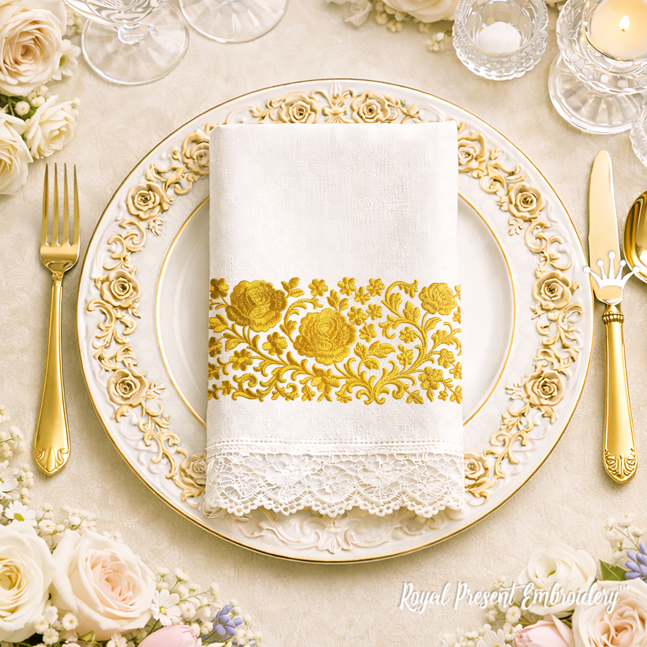 Бордюр розы прямоугольный — это дизайн машинной вышивки в цифровом формате, выполненный в виде вытянутого цветочного орнамента с розами. Композиция построена как декоративный бордюр, который легко вписывается в края и линии изделий, создавая аккуратное и завершённое оформление.