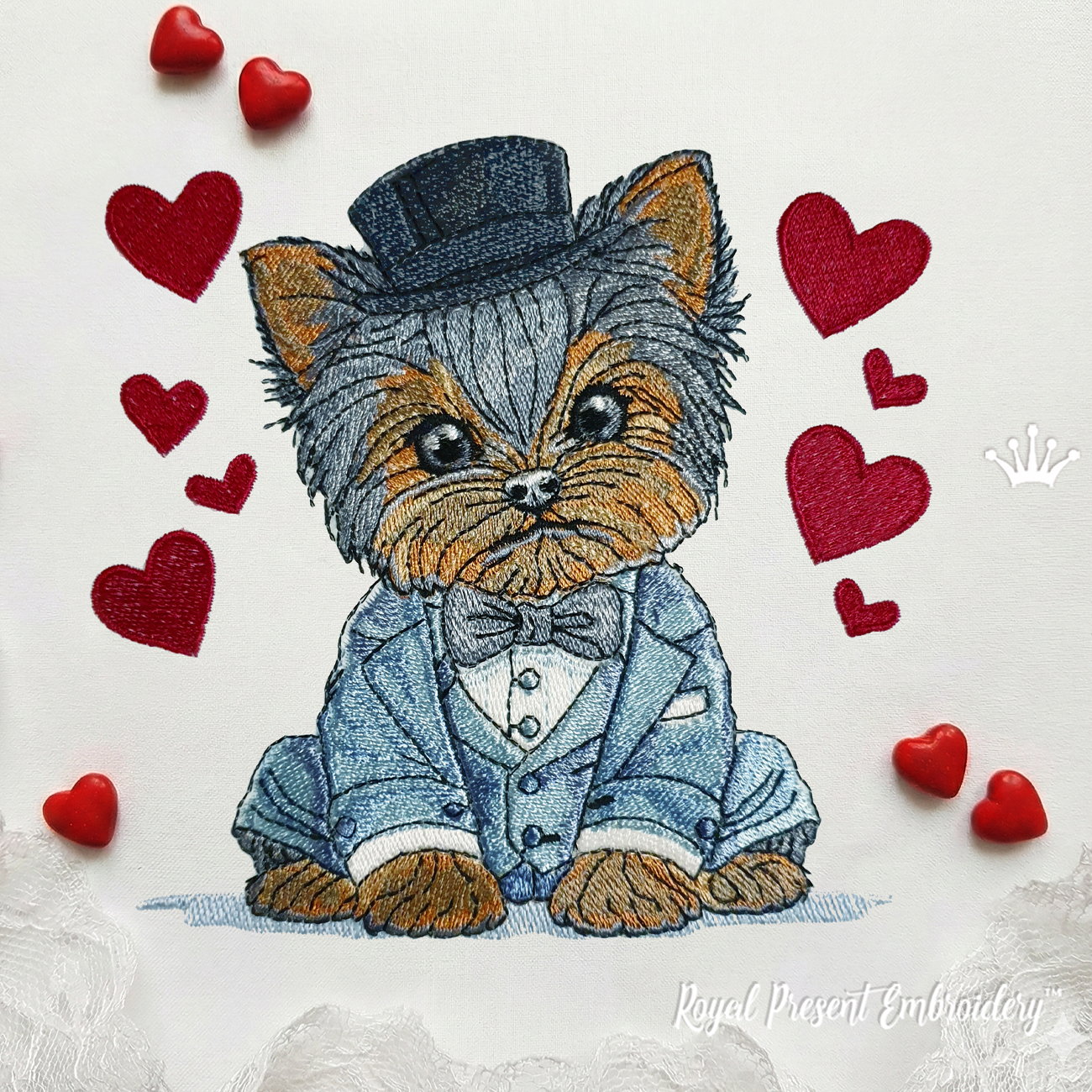 Нежный и стильный дизайн с йоркширским терьером в костюме и сердечками — идеальный вариант для Дня святого Валентина, подарков и всех любителей породы.