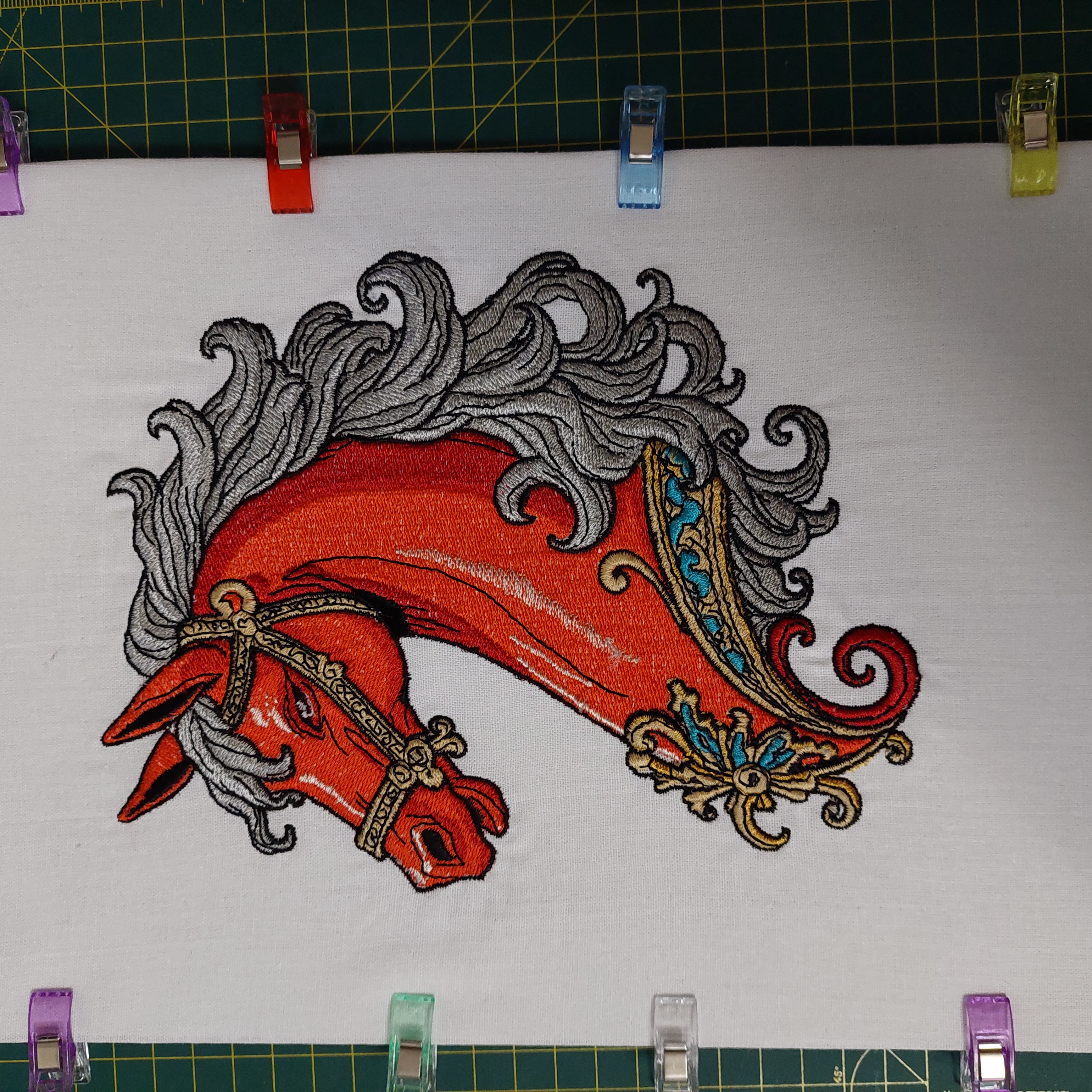 Этот утончённый дизайн машинной вышивки изображает величественный портрет красной лошади в роскошном барочном стиле. Богатая детализация гривы, изящные узоры и выразительный взгляд делают его не просто мотивом, а настоящим украшением любой вышивальной композиции. Такой дизайн отлично подойдёт для тематических проектов, особенно в преддверии 2026 года Красной Лошади — по восточному календарю.