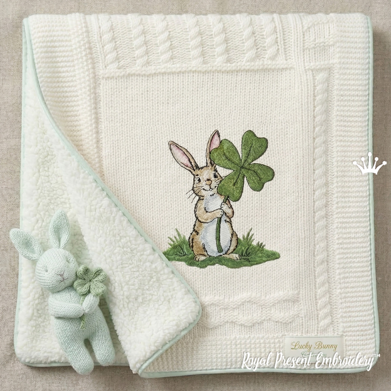 Кролик с клевером — нежный и очаровательный дизайн машинной вышивки с атмосферой сказочной истории и символикой удачи. Милый зайчик с четырёхлистным клевером создаёт тёплое настроение и идеально подходит для оформления детских изделий. Дизайн прекрасно смотрится на пледах, одеялах, подушках, одежде для малышей и станет отличным выбором для вышивки для детей, в том числе для мальчиков. Также отлично подойдёт для тематических проектов ко Дню Святого Патрика.