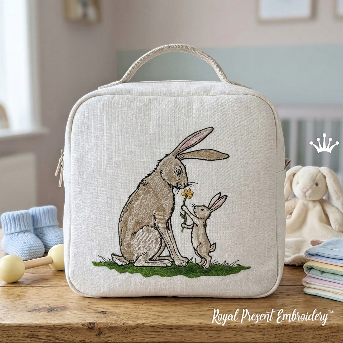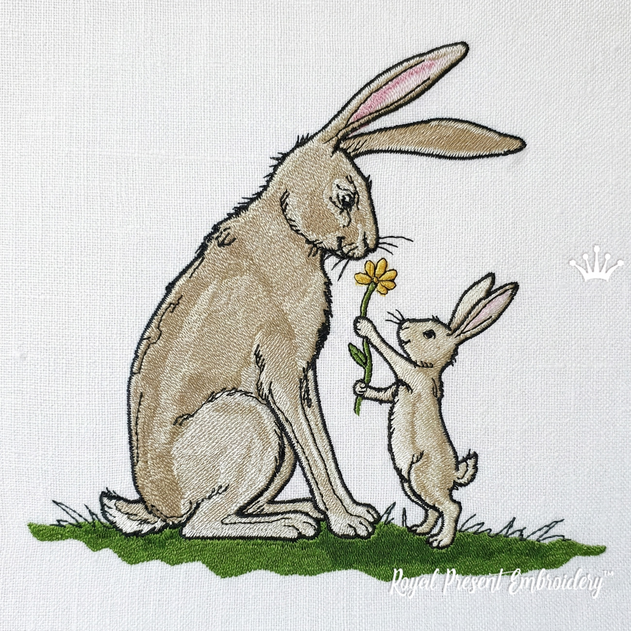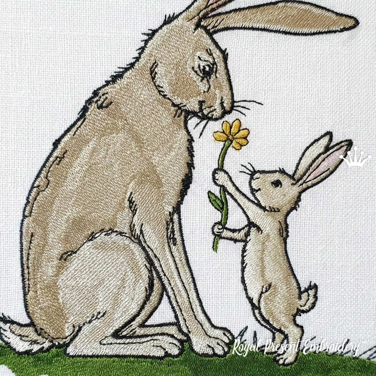 Маленький кролик дарит цветок маме — нежный дизайн машинной вышивки с трогательной пасхальной сценой. Идеально подходит для кухонных полотенец, детских вещей, подушек, салфеток и весеннего декора. Мгновенная загрузка файлов.