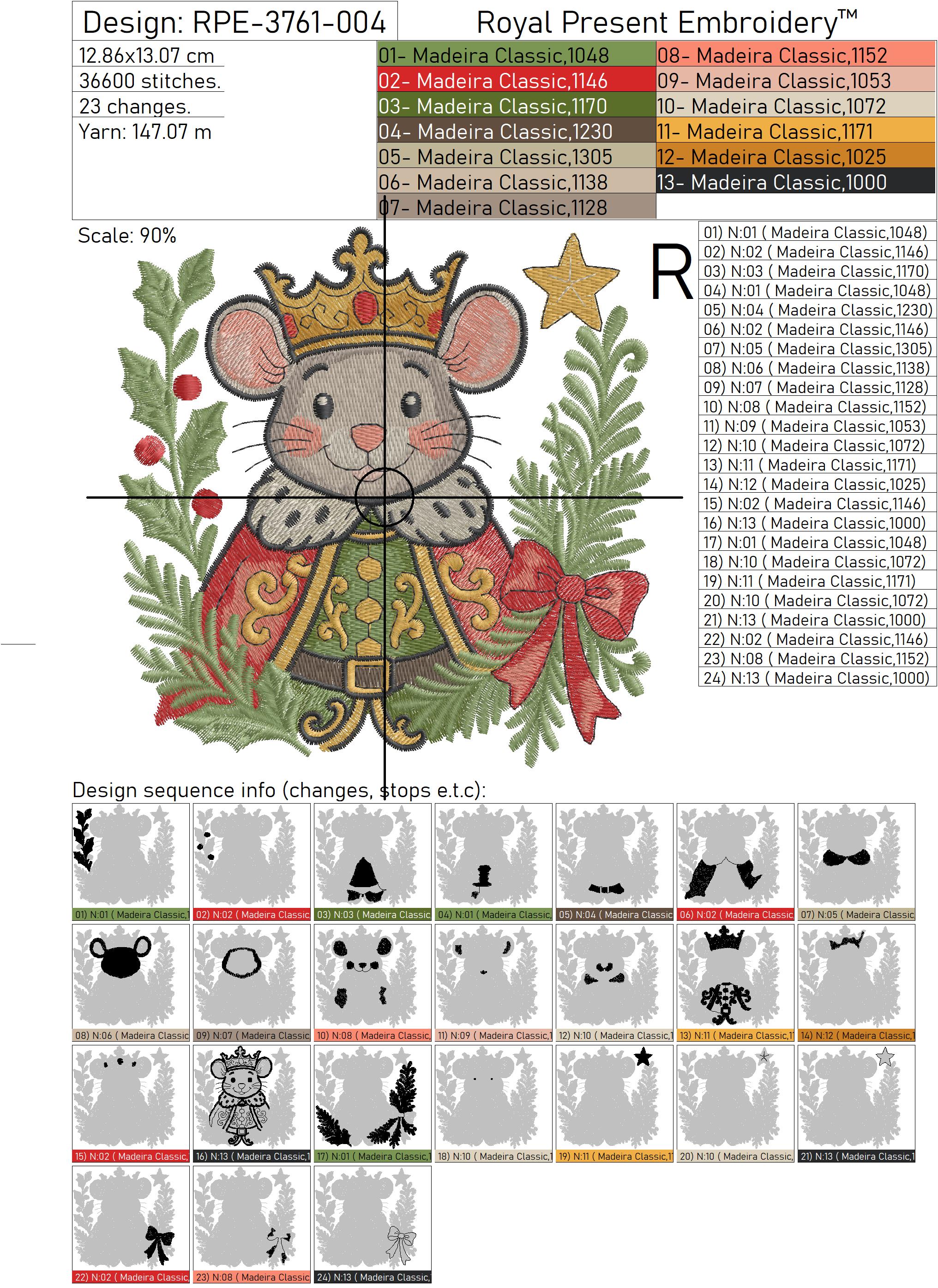 Этот милый и праздничный дизайн машинной вышивки изображает Мышонка-Короля в роскошной короне, окружённого еловыми веточками, ягодами и декоративными элементами рождественского орнамента. Стиль сочетает барочную выразительность и мультяшную доброту, делая дизайн идеальным для новогодних проектов и уютного сезонного декора.