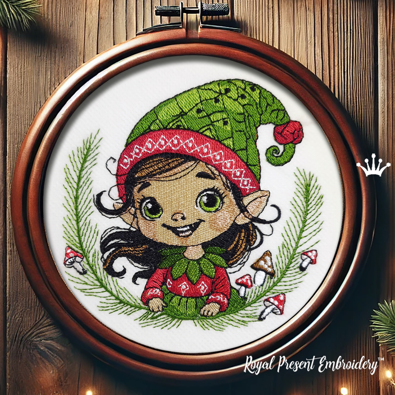 Очаровательный новогодний гномик-девочка с зелёной шапочкой, в окружении еловых веток и грибочков — это настоящий праздник в каждом стежке! Дизайн выполнен в рождественском стиле с элементами сканди и винтажной сказочности. Милое выражение лица, детально проработанные элементы и праздничное настроение делают этот сюжет уникальным украшением для ваших зимних проектов.