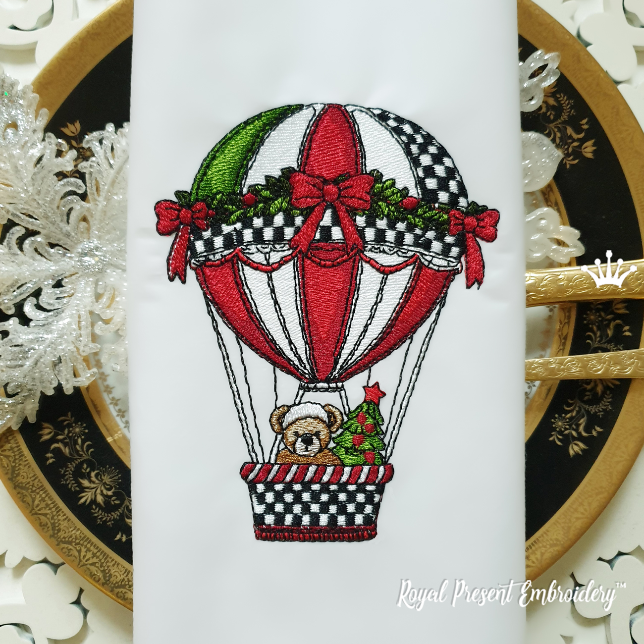 Этот праздничный дизайн представляет собой очаровательную новогоднюю сцену: милый мишка выглядывает из воздушного шара, украшенного ёлкой и лентами. Композиция выполнена в винтажно-рождественском стиле, сочетающем уют, сказочность и изящество. Такой сюжет создаёт настроение уюта и волшебства, делая его идеальным для праздничных проектов.