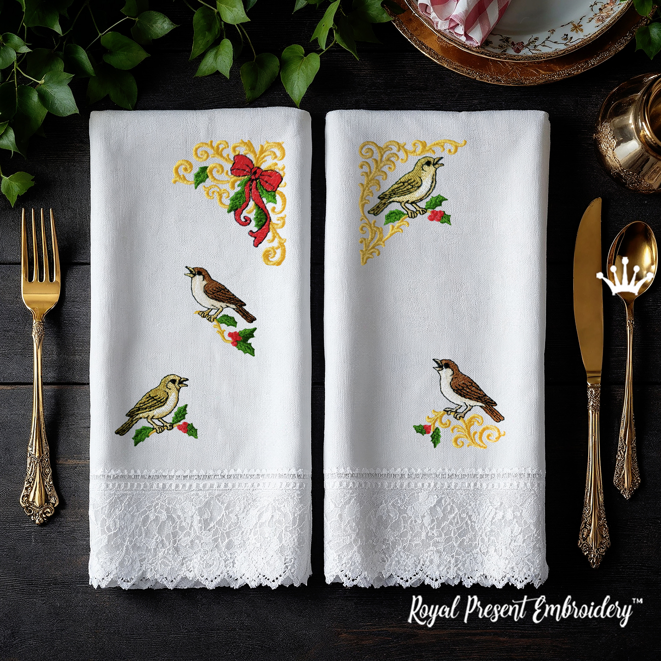 Набор дизайнов машинной вышивки «Новогодние мини птички барокко» — это изящный акцент для праздничного текстиля и зимнего декора. Миниатюрные мотивы прекрасно подойдут для кухонных полотенец, салфеток, фартуков и декоративных мешочков для подарков.