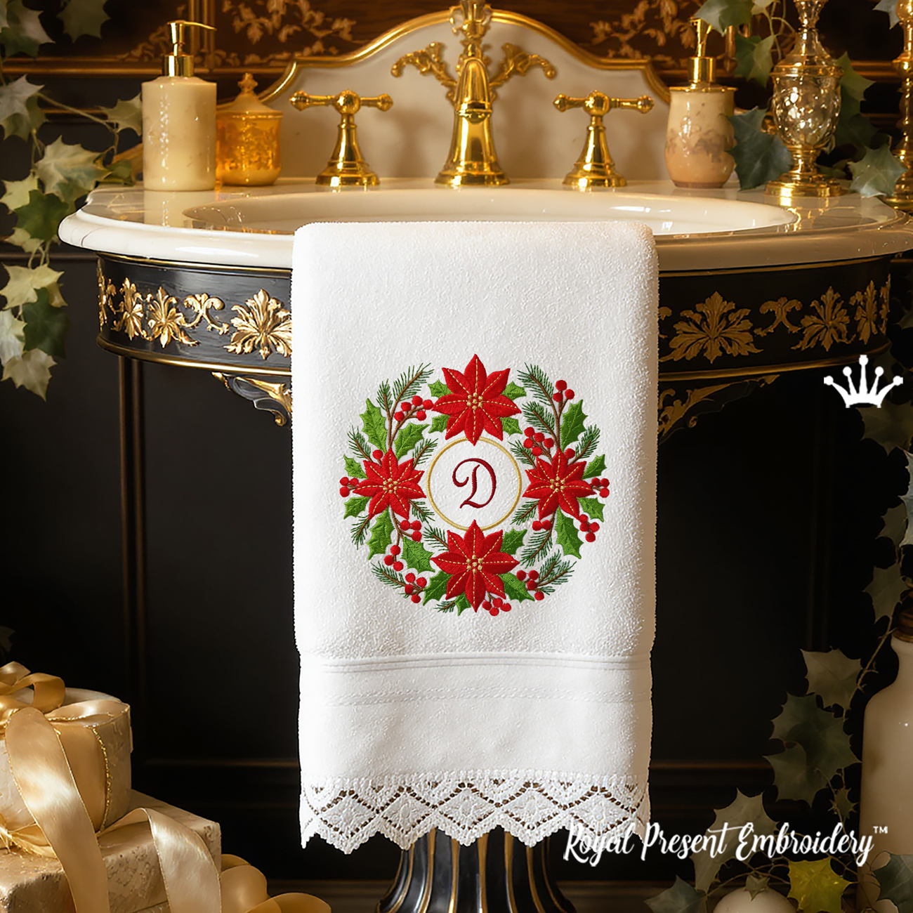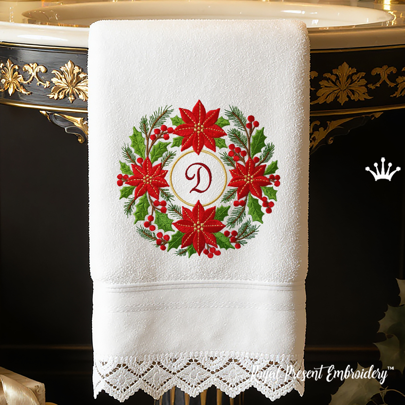 Этот изысканный дизайн машинной вышивки представляет собой круглый новогодний орнамент с яркими пуансеттиями, еловыми веточками и ягодами. Композиция выполнена в классическом рождественском стиле с легким винтажным настроением, что делает дизайн универсальным и элегантным. Круглая форма идеально подходит для монограмм и центральных композиций, а детальная проработка цветов придаёт вышивке глубину и праздничный характер.