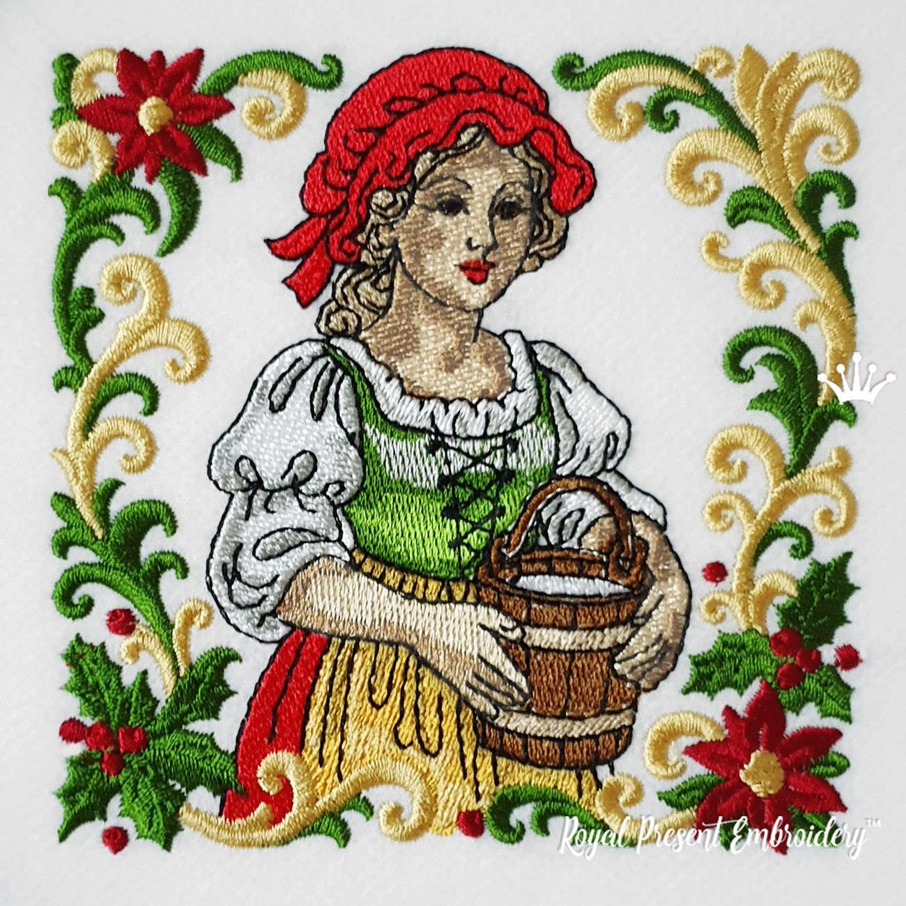 Рождественская Девушка доярка дизайн машинной вышивки вдохновлён классической английской песней "12 дней Рождества", где героиня символизирует "eight maids a-milking". Это очаровательный и уютный сюжет, который оживит праздничный текстиль. Подходит для пялец 100×100 мм (примерно 4×4 дюйма) — отличный выбор для небольших проектов.