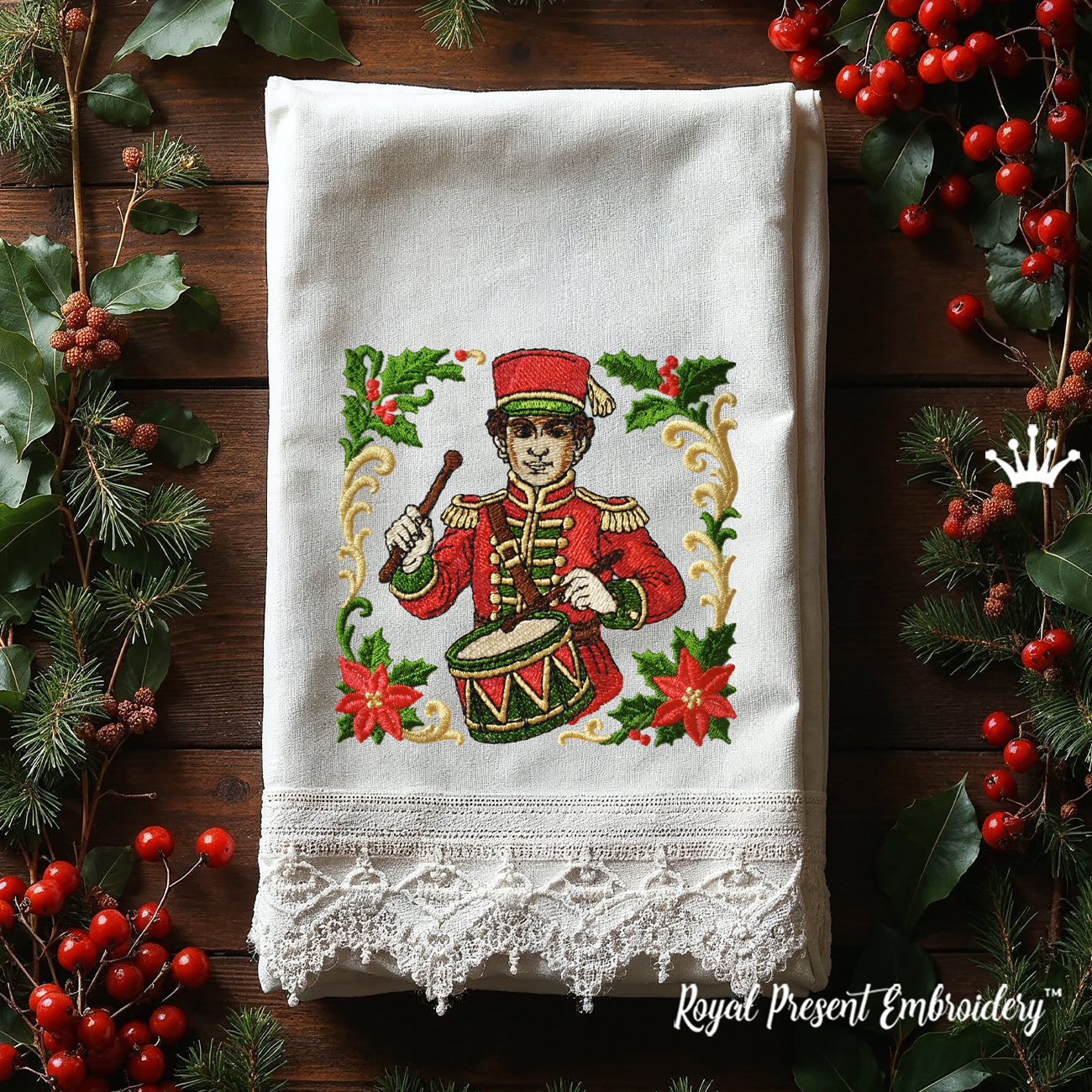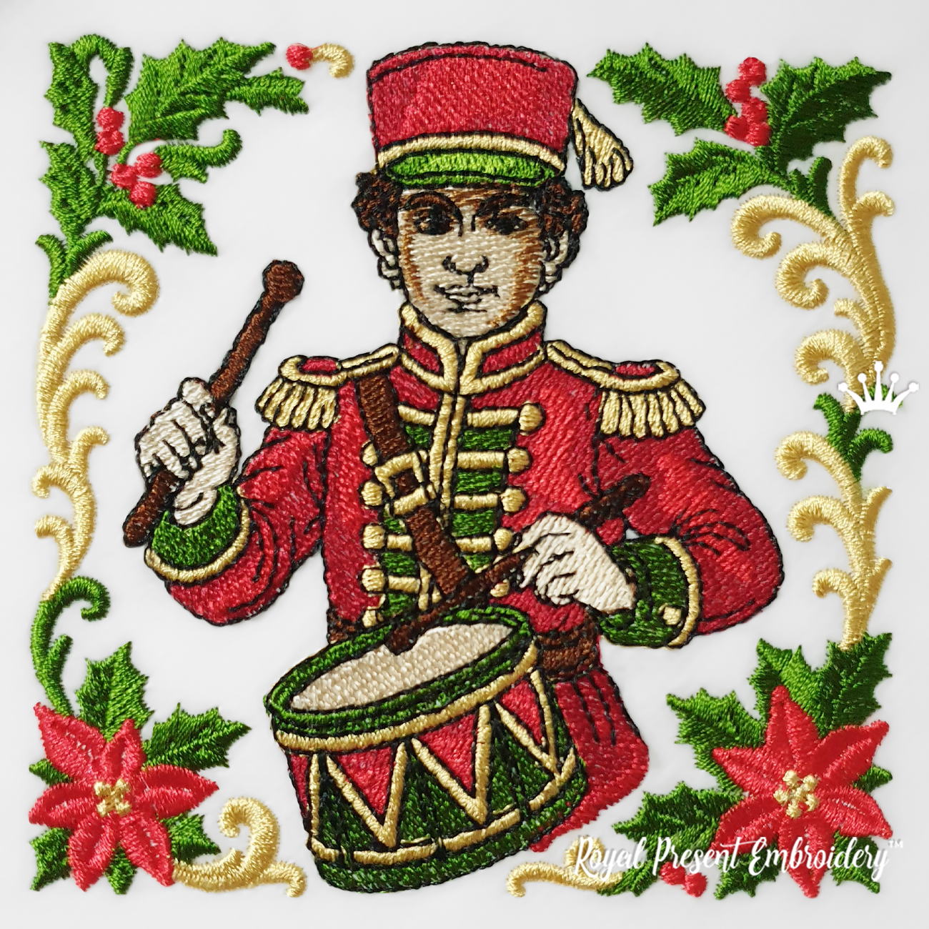 Погрузитесь в волшебную атмосферу зимнего праздника с дизайном Рождественский Барабанщик. Эта машинная вышивка выполнена в классическом рождественском стиле: строгий, нарядный солдат в красной форме с барабаном, украшенный листиками падуба и золотыми завитками. Детализированное исполнение придаёт дизайну объём и выразительность — он точно привлечёт внимание.