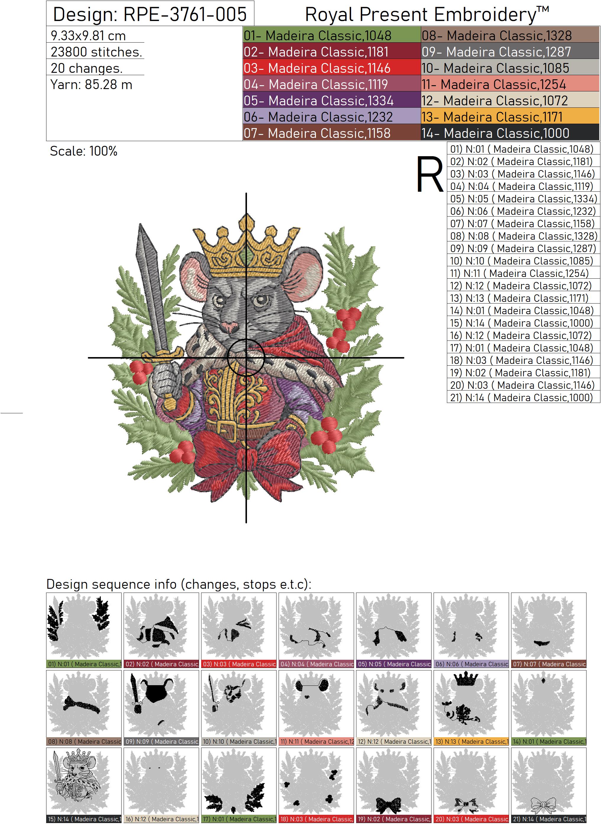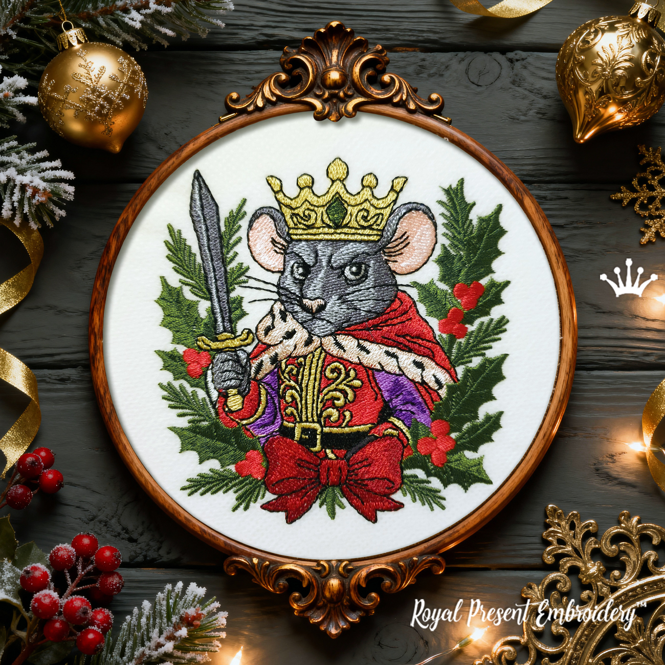 Этот эффектный дизайн машинной вышивки изображает Мышиного Короля в королевской мантии и короне, с мечом в лапе и на фоне праздничного венка из еловых ветвей и ягод. Стиль — рождественская барочная классика с яркими насыщенными цветами и детализированными декоративными элементами. Дизайн отлично подходит для создания атмосферных, драматичных и одновременно праздничных проектов.