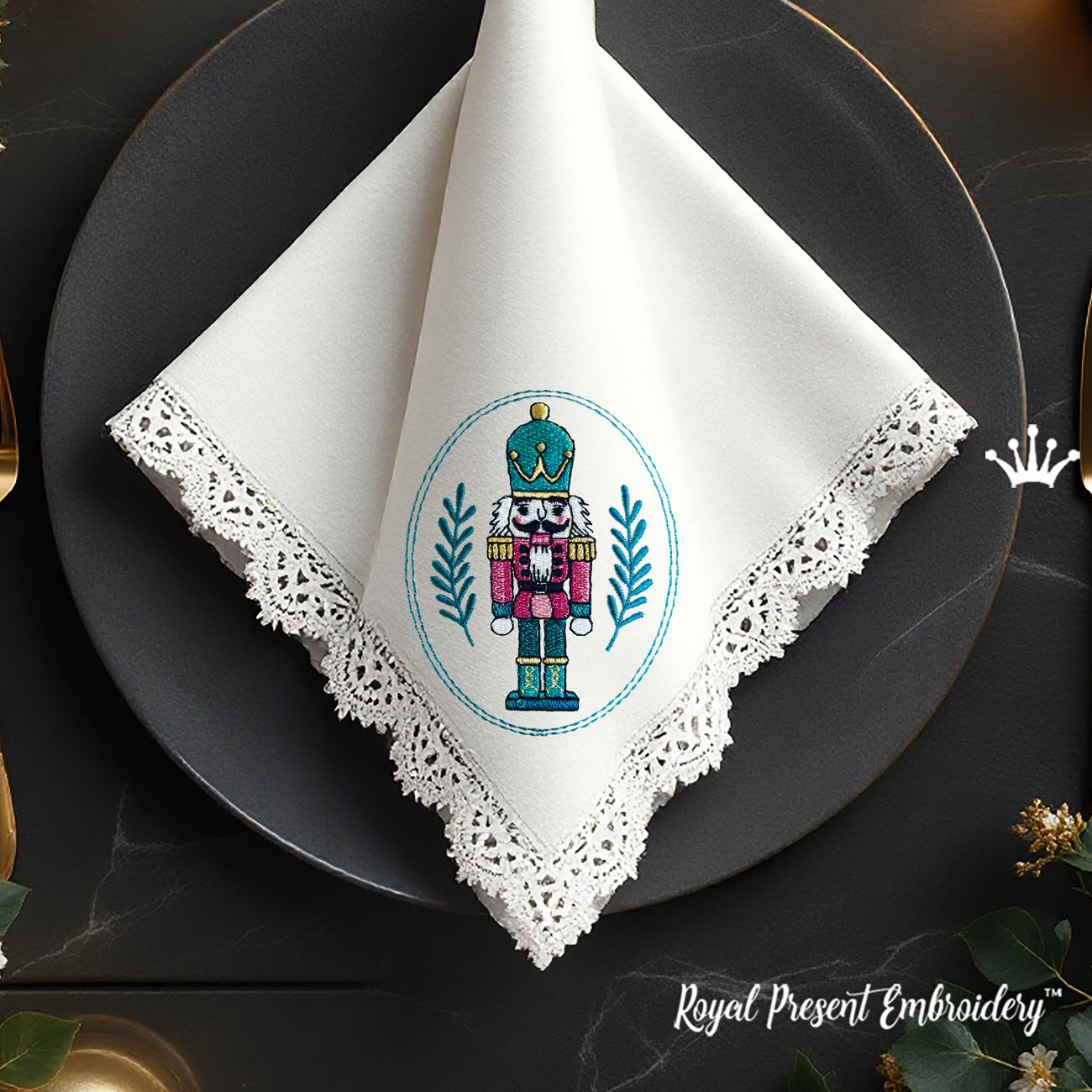 Погрузитесь в атмосферу праздничного ретро с этим очаровательным дизайном машинной вышивки. Центральный элемент — классический Щелкунчик в королевской униформе, обрамлённый нежными еловыми ветвями в минималистичной овальной рамке. Дизайн выполнен в рождественском стиле с винтажными акцентами, и идеально подойдёт для украшения как повседневного, так и праздничного текстиля.