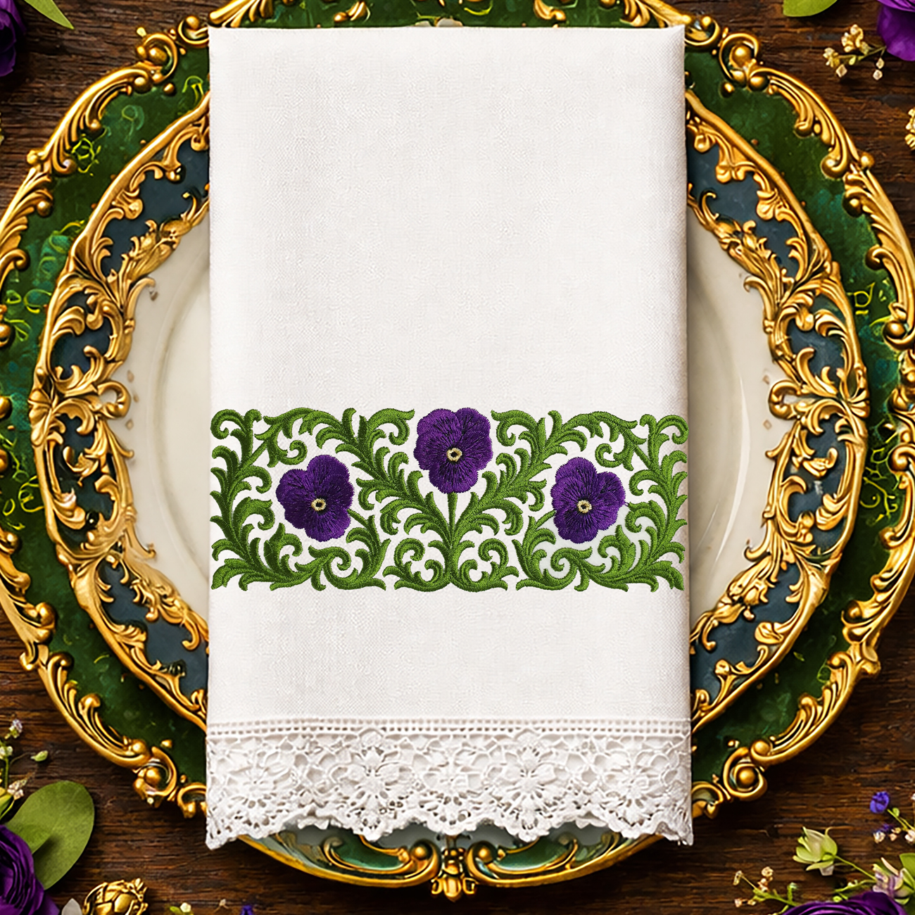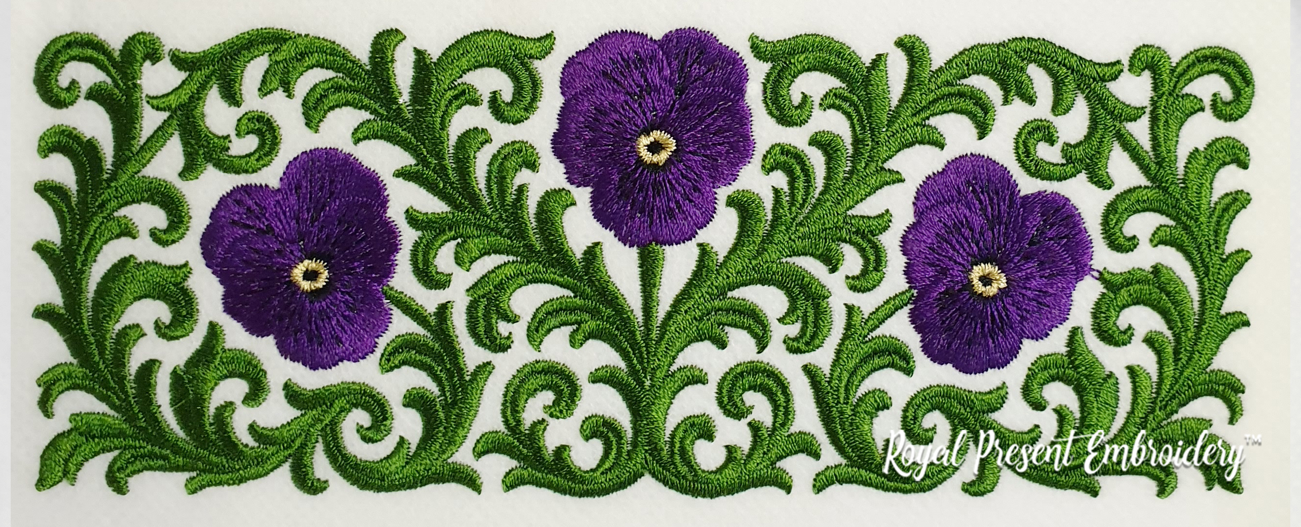 Цветочный бордюр Барокко с анютиными глазками дизайн машинной вышивки выполнен в классическом декоративном стиле и отлично подходит для оформления натурального текстиля, включая льняные полотенца. Орнамент смотрится выразительно и аккуратно, подчёркивая фактуру ткани и создавая благородный декоративный акцент.