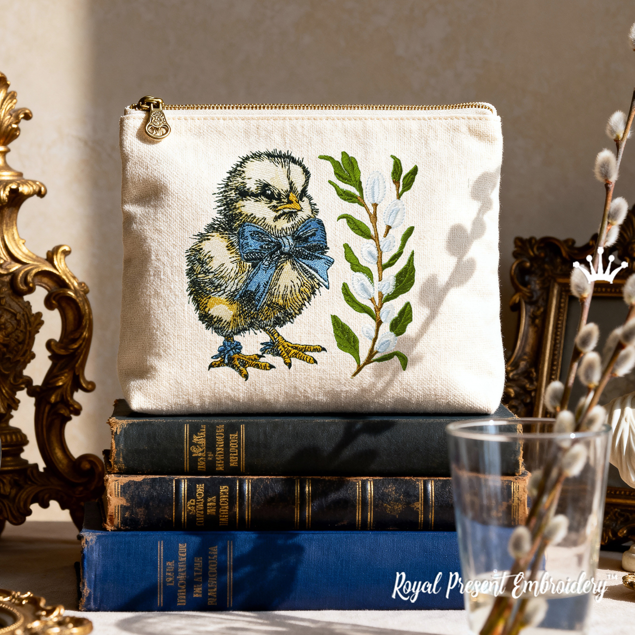 Хотя тематика пасхальная, этот дизайн отлично впишется и в сезонный весенний декор. Верба — символ обновления и чистоты, а цыплёнок с бантом добавит уюта и шарма в ваш текстиль.