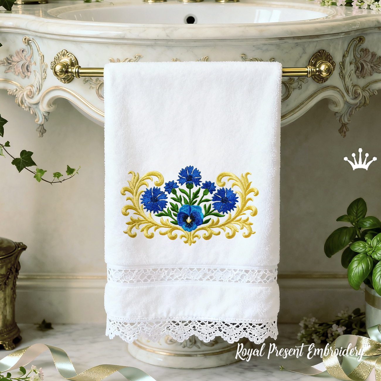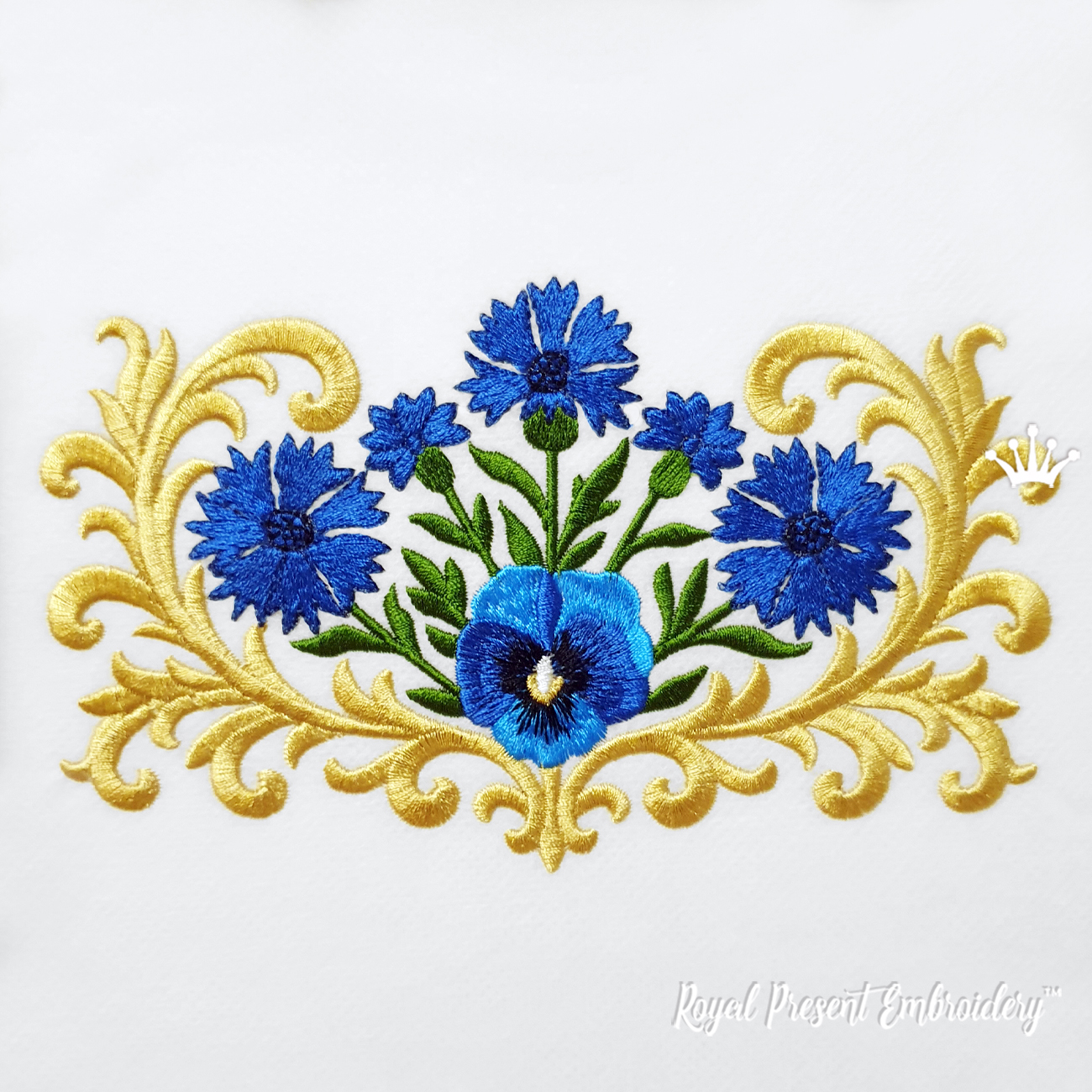 Изысканный бордюр «Васильки и анютины глазки барокко» — это элегантная композиция цветов, выполненная в декоративном барочном стиле. Узоры выглядят утончённо и объёмно благодаря плавным линиям, тонким прожилкам и аккуратной проработке лепестков. Такой дизайн машинной вышивки подчёркивает декоративность проекта и идеально подходит как для классического, так и для современного интерьера.