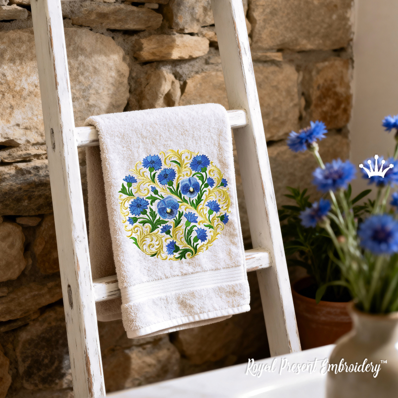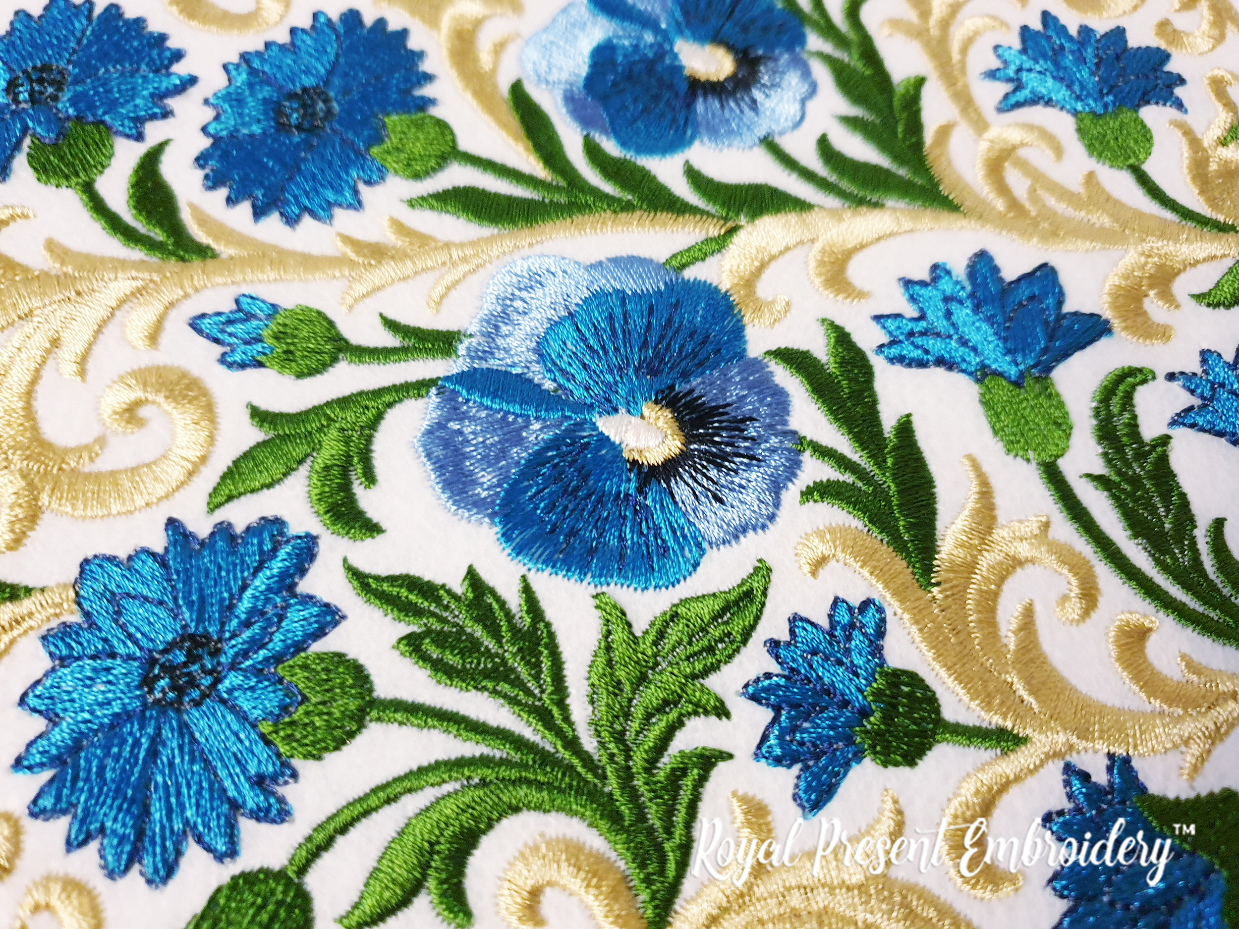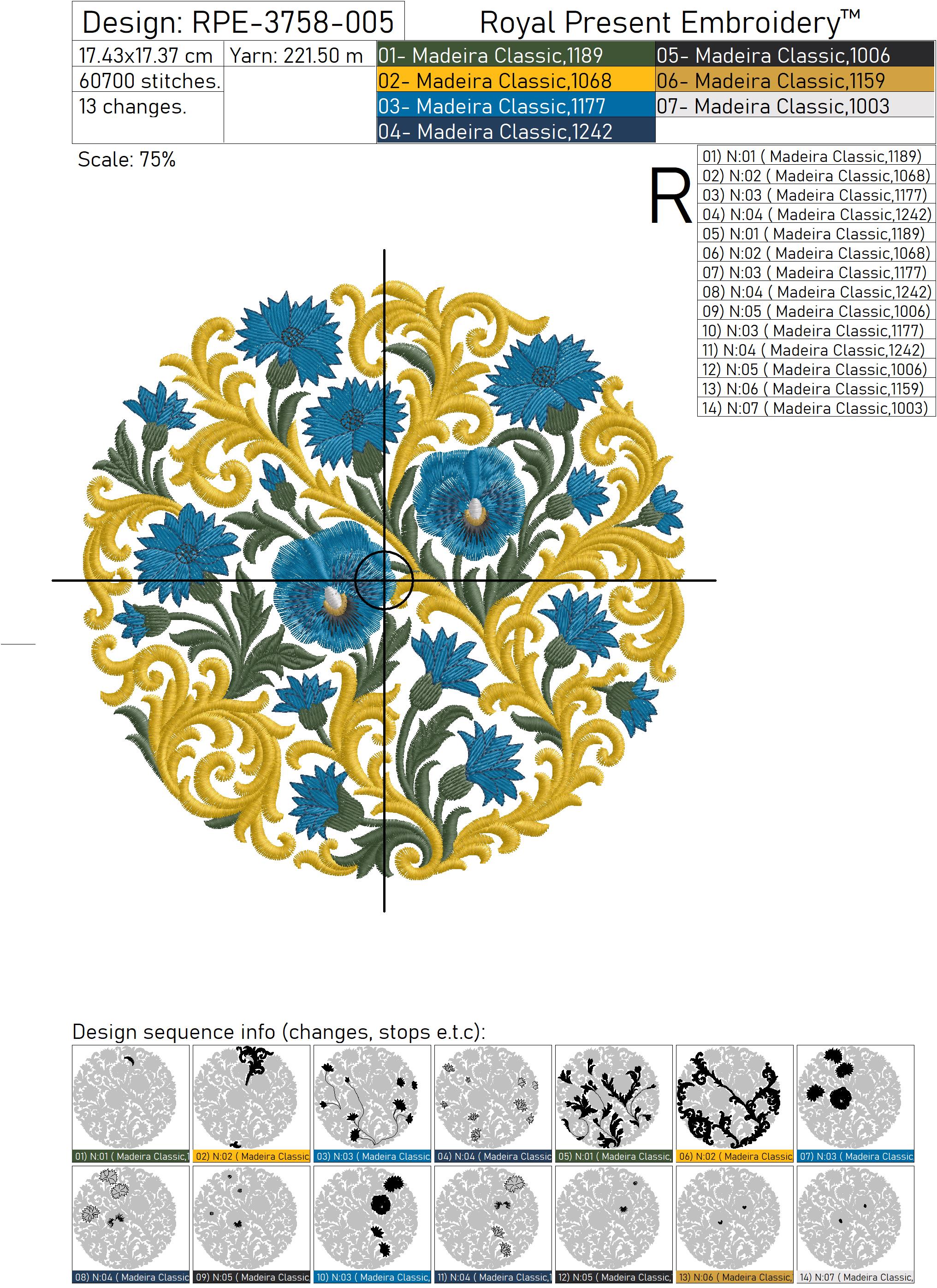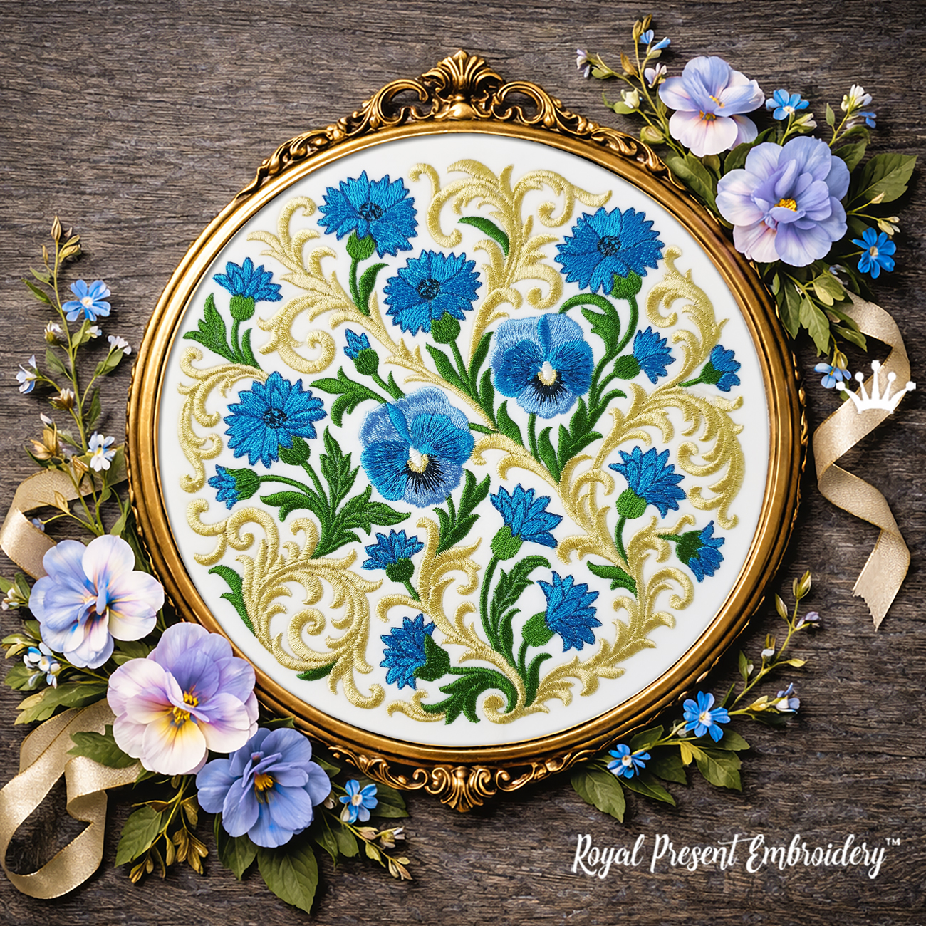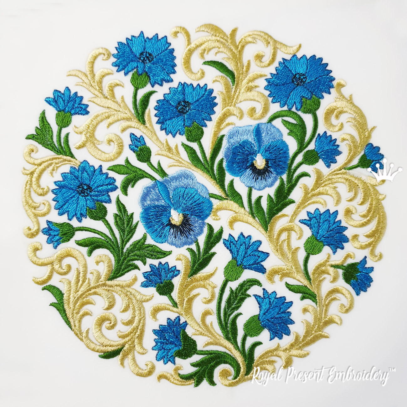 Дизайн «Васильки барокко круглый орнамент большой» — это изысканная машинная вышивка, сочетающая в себе классические барочные завитки и выразительные васильки, выполненные в богатой цветовой палитре: от насыщенного синего до мягкого золотого и ярко-зелёного. Композиция представляет собой круг, который идеально подходит для размещения в центре изделия — как художественный акцент.