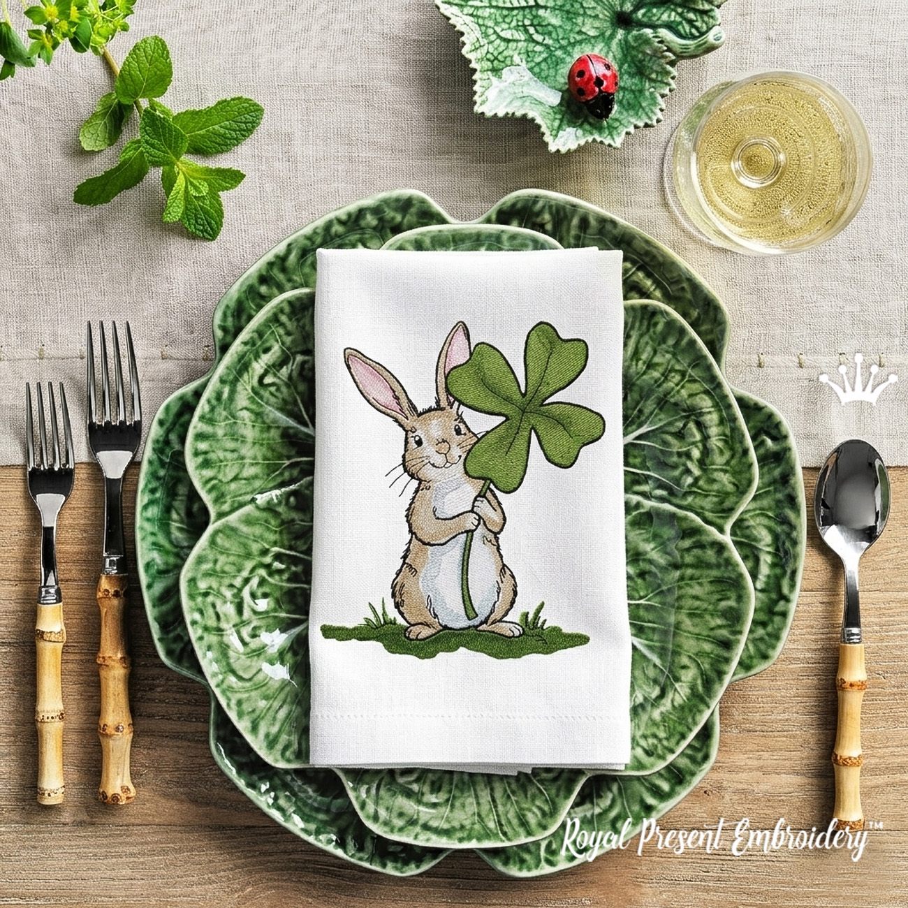 Весенний кролик с листом клевера – дизайн машинной вышивки для салфеток и полотенец