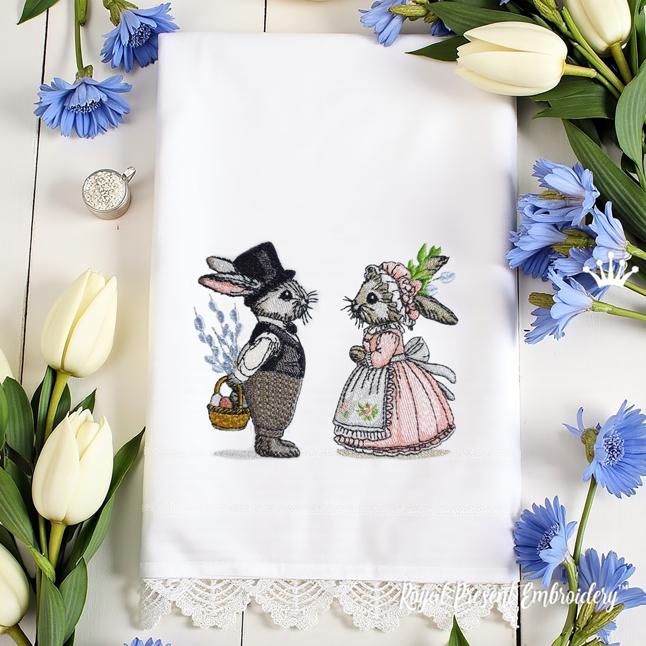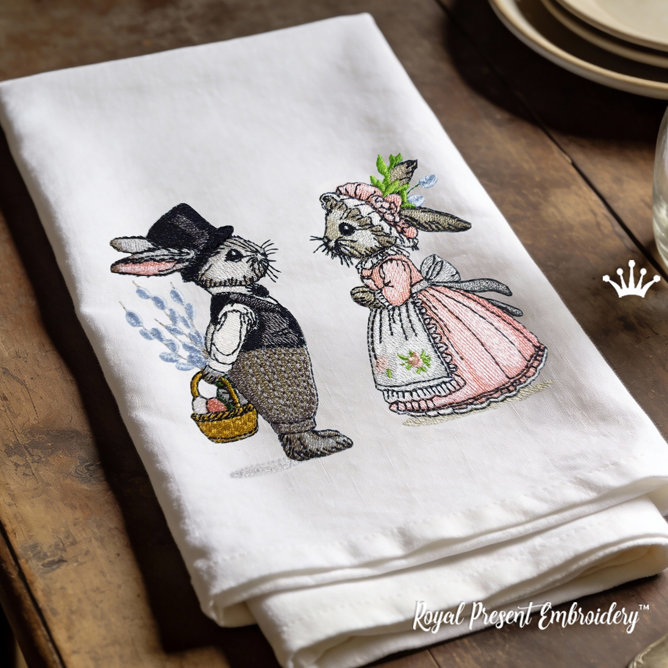 Очаровательный набор "Два винтажных весенних кролика" — это нежная история любви в стиле старинной иллюстрации. Кролик в цилиндре с корзиной пасхальных яиц и крольчиха в розовом платье и чепчике выглядят как герои винтажной открытки. Эти дизайны прекрасно подойдут для украшения пасхального декора, детского текстиля, салфеток, полотенец или интерьерных акцентов.