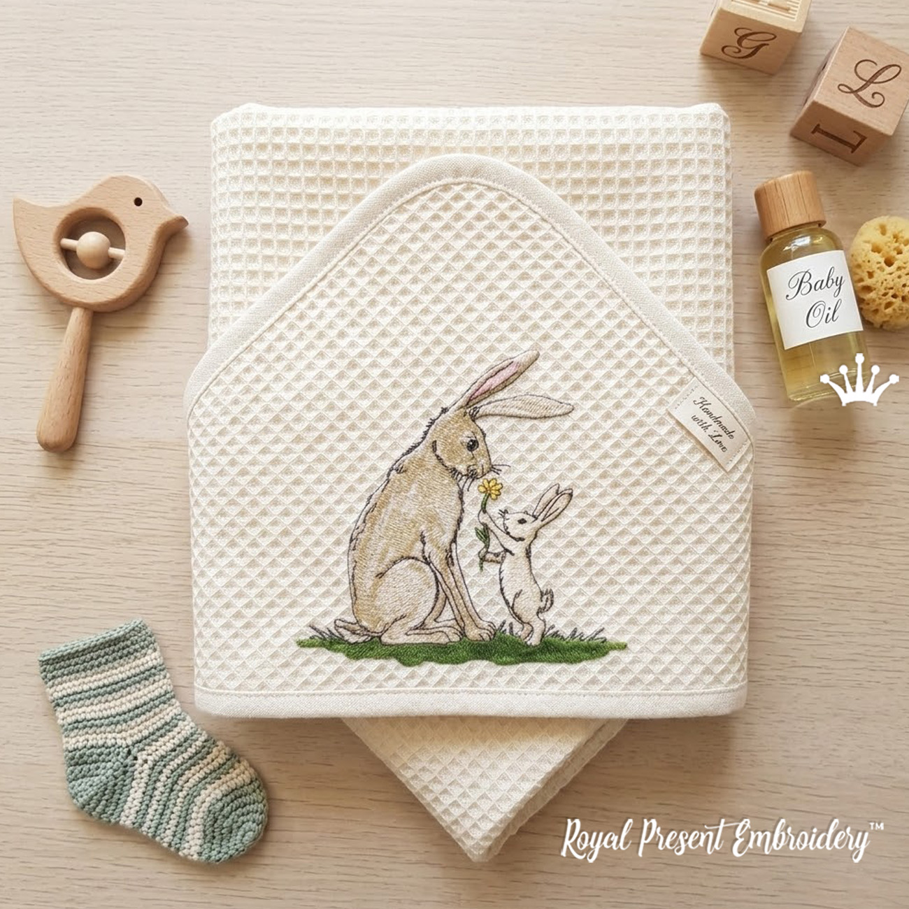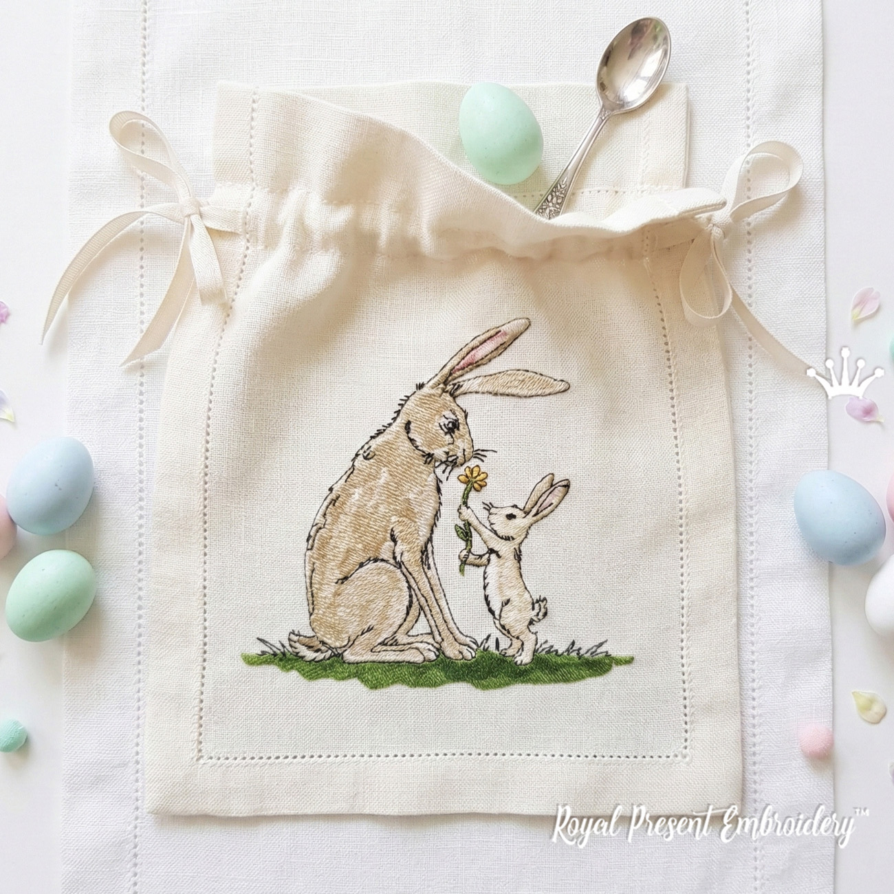 Создайте по-настоящему трогательные и душевные вещи! Представляем невероятно милый дизайн машинной вышивки «Зайчик дарит цветок маме». Этот теплый сюжет, где маленький зайчонок бережно протягивает желтый цветочек своей маме, символизирует самую нежную любовь и заботу.