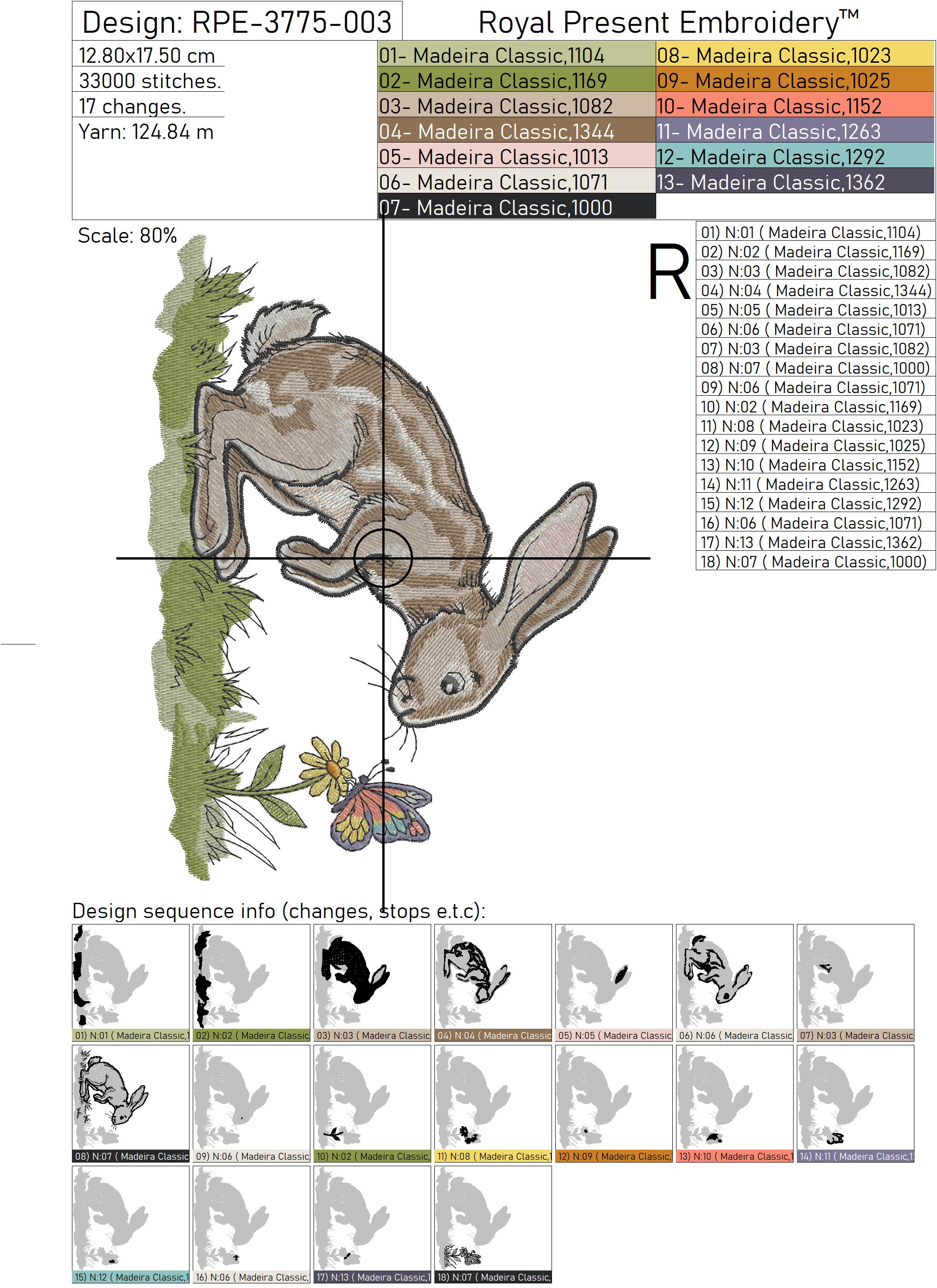Профессиональная оцифровка обеспечивает аккуратные контуры, плавные переходы оттенков и сбалансированную плотность стежков. Текстура шерсти зайца выглядит мягко и естественно, а цветок и бабочка сохраняют чёткую форму даже на натуральных тканях — льне, хлопке и канвасе.