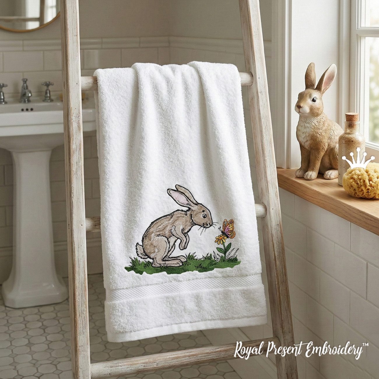Нежный и трогательный дизайн машинной вышивки с реалистичным зайцем, цветком и бабочкой создаёт атмосферу весны, уюта и лёгкости. Композиция выполнена в естественной палитре и прекрасно подойдёт для сезонного текстиля, пасхального декора и оформления детской комнаты.