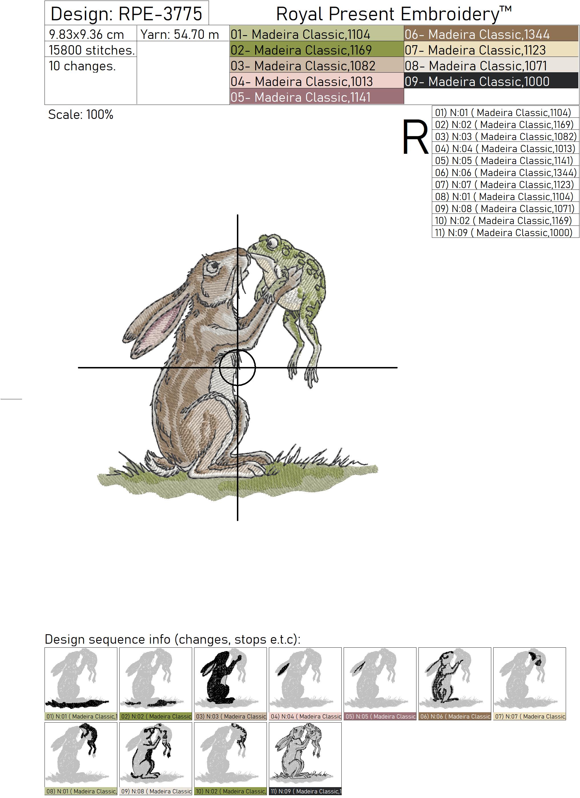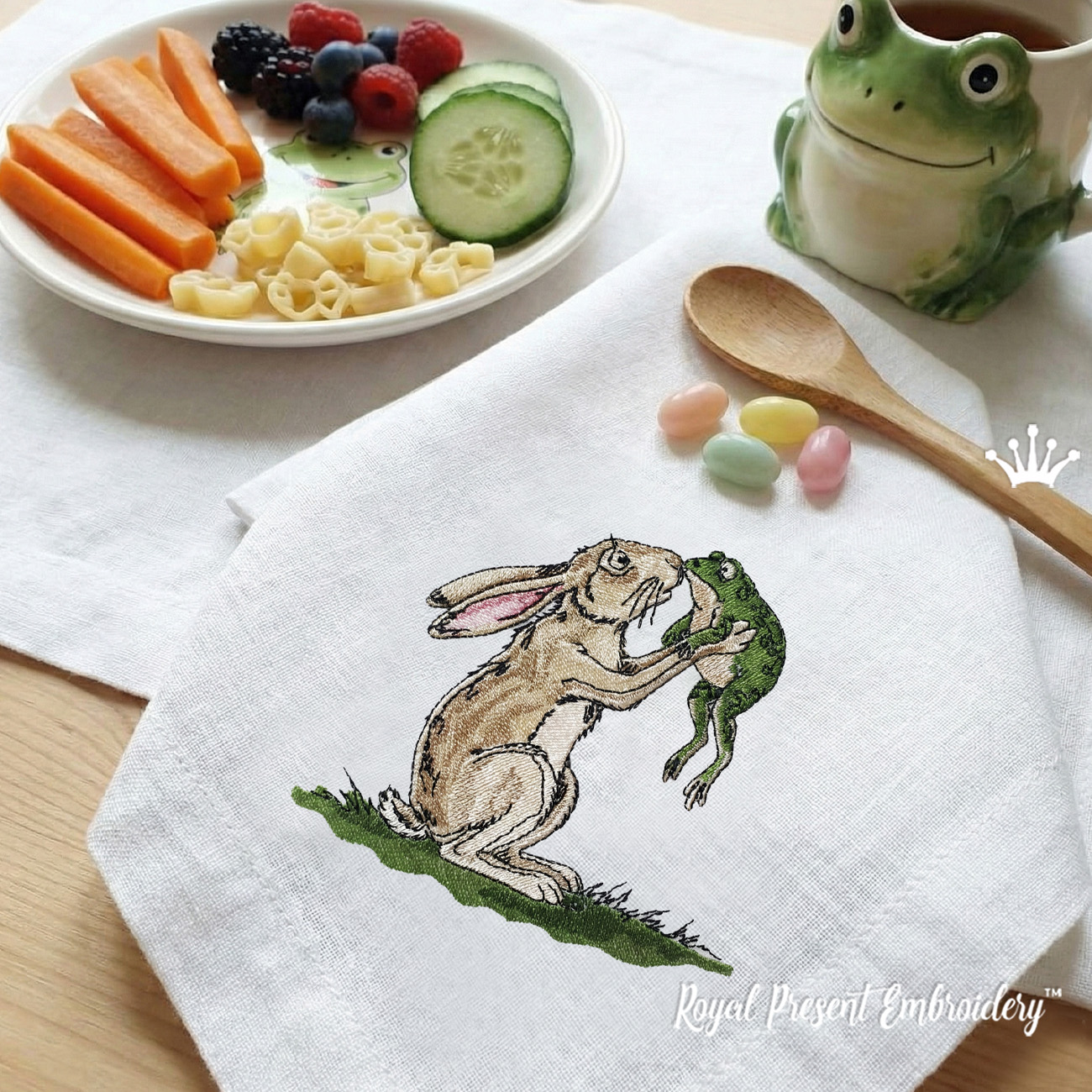 Заяц с лягушкой — трогательный и выразительный дизайн машинной вышивки с лёгким акварельным эффектом и тонкой графичной прорисовкой. Сюжет с нежным прикосновением зайца и лягушки создаёт атмосферу доброй сказки и подходит для детских изделий, пледов, подушек, сумок и авторских текстильных проектов. Дизайн тщательно оцифрован с мягкими переходами стежков и аккуратными контурами для красивого и живого результата. Мгновенная загрузка в популярных форматах для вышивальных машин.