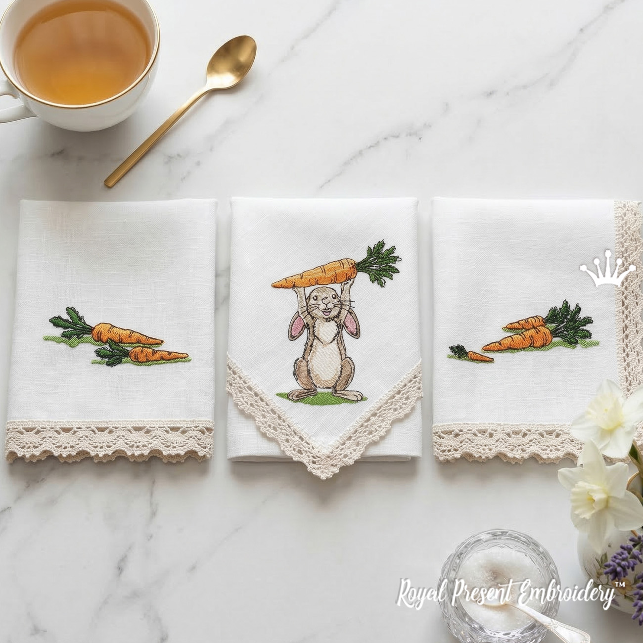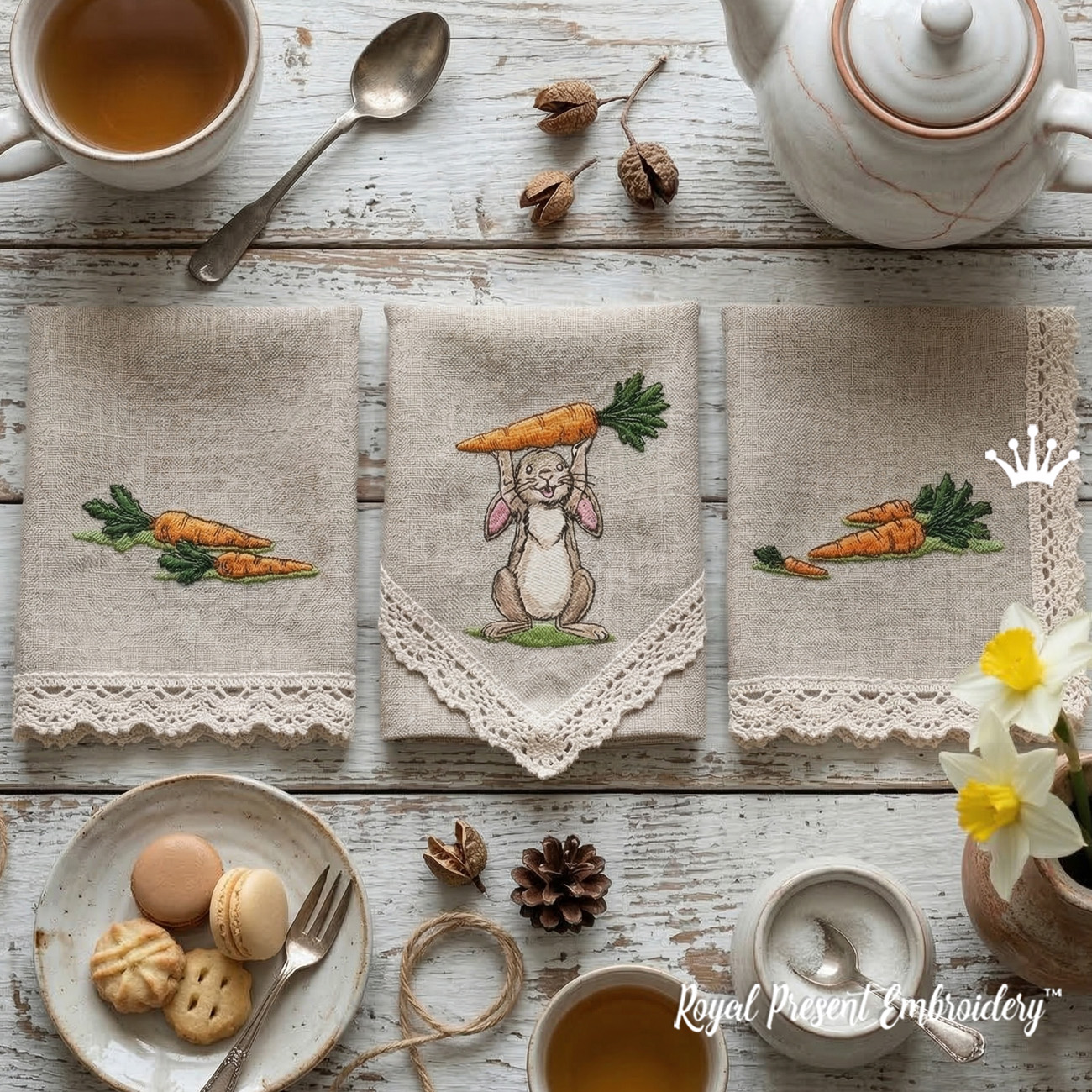 Дизайн-компаньон для идеального сочетания Обратите внимание: у этого мотива есть идеальное дополнение! В нашем каталоге также представлен набор-компаньон «Заяц с морковками». Используйте их вместе, чтобы создать гармоничную коллекцию текстиля в едином стиле (например, комплект из скатерти и салфеток или набор детской одежды).