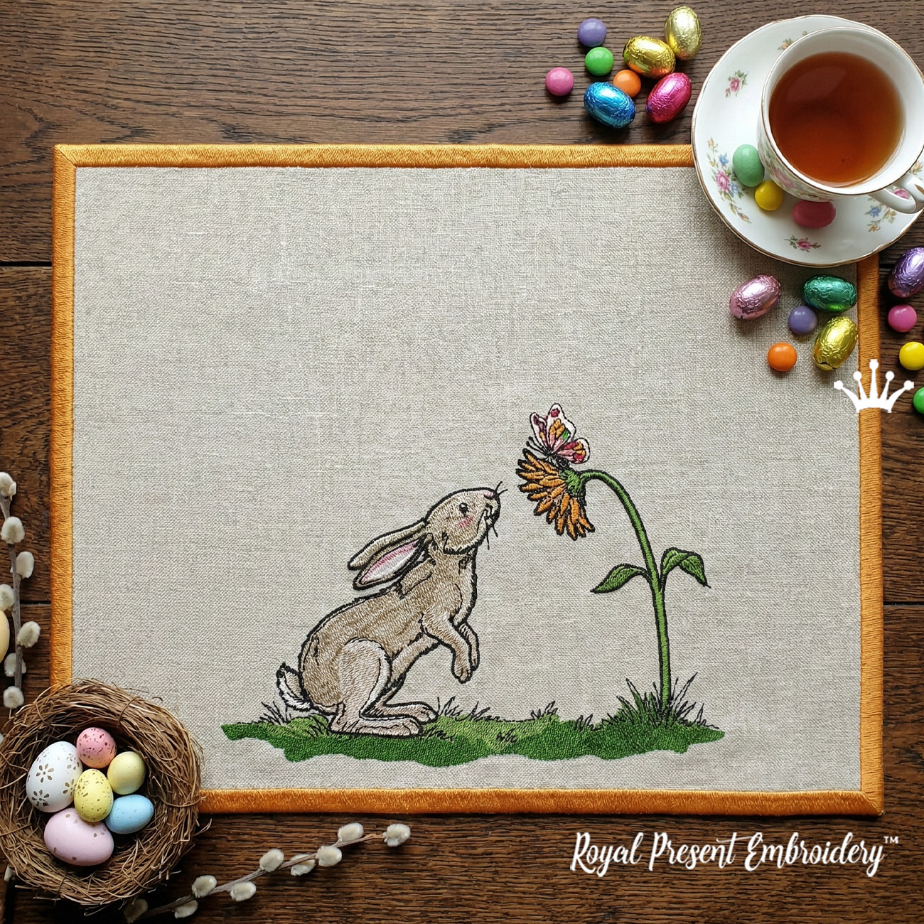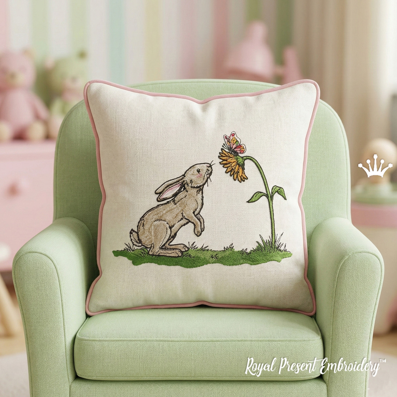 Заяц с подсолнухом и бабочкой — нежный весенний дизайн машинной вышивки с реалистичным зайчиком и солнечным цветком. Идеально подойдёт тем, кто ищет вышивка заяц, машинная вышивка с подсолнухом, пасхальная вышивка заяц, весенний дизайн для подушки или вышивка для детской комнаты.