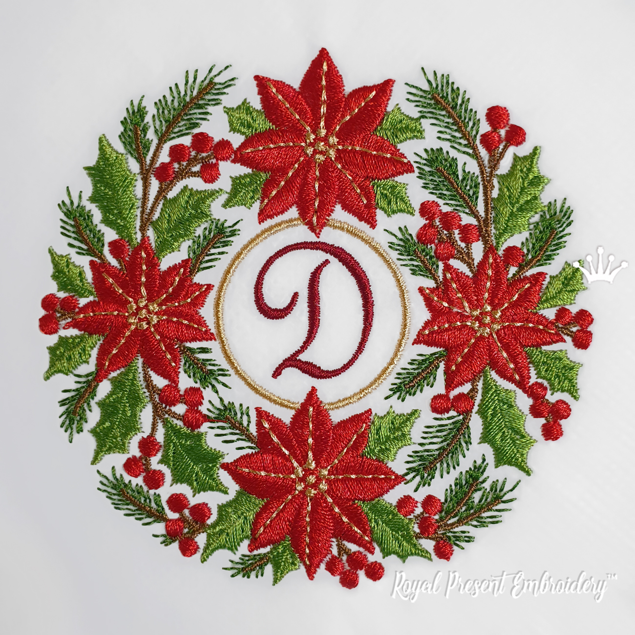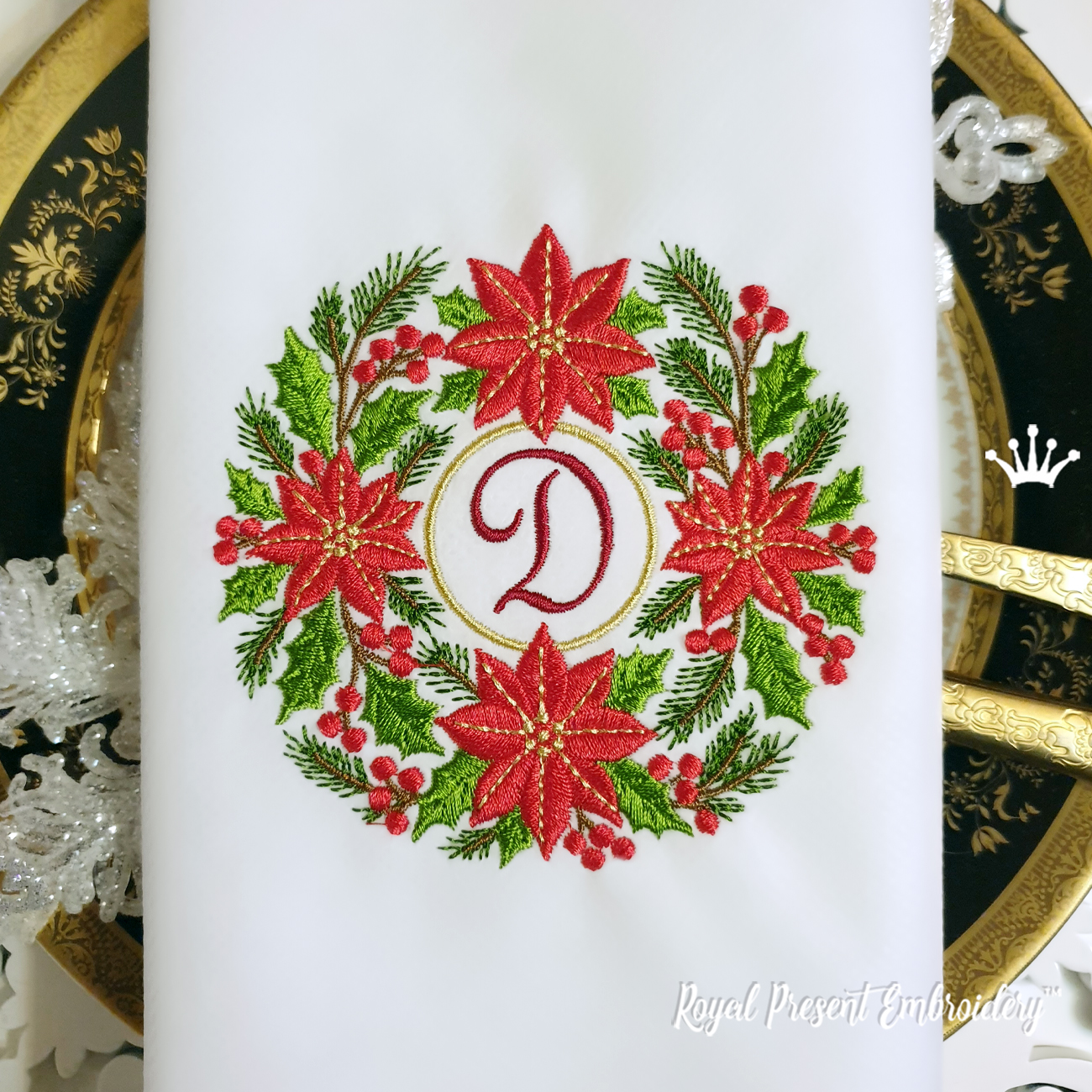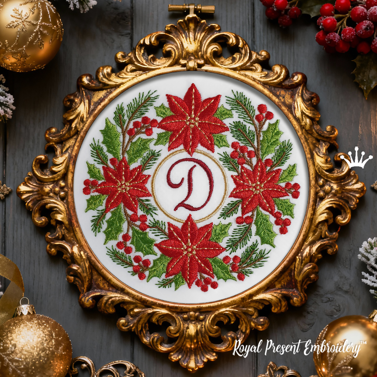 Этот изысканный дизайн машинной вышивки выполнен в виде круглой декоративной рамки с зимними пуансеттиями, еловыми ветвями и ягодами. Композиция навеяна классическим рождественским стилем с элементами винтажа и аристократического декора. Центральная часть рамки идеально подходит для размещения монограммы, инициалов или небольшого символа, что делает дизайн особенно универсальным и персонализируемым.